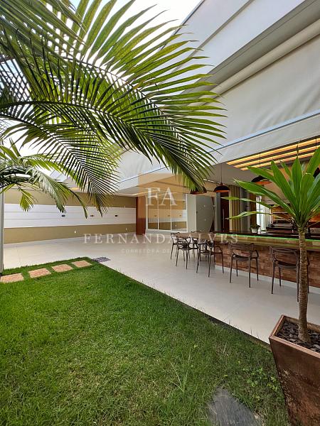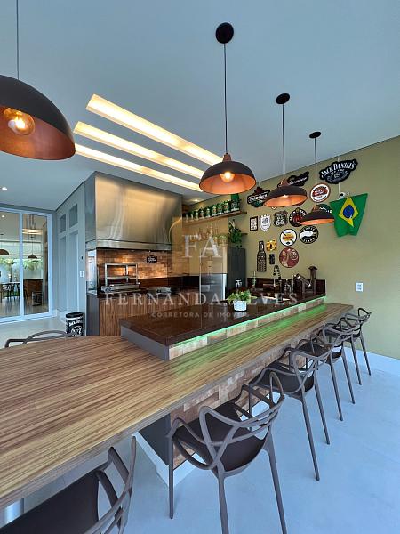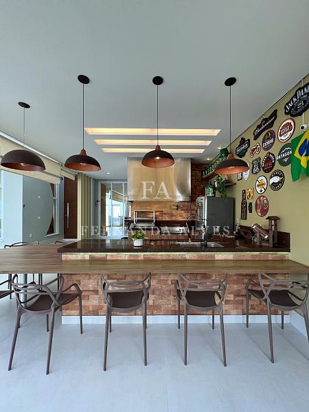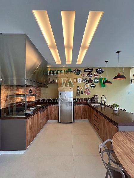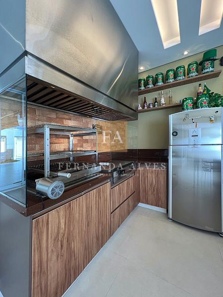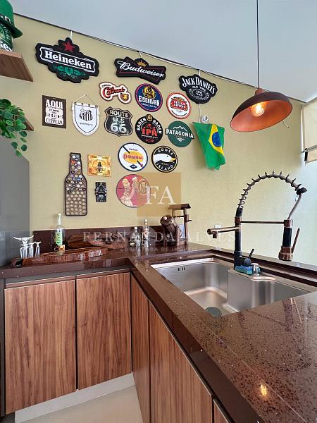 Ao entrar você encontra com um aconchegante Espaço Gourmet com churrasqueira carvão, fogão industrial, coifa box, geladeira e torneira com misturador.