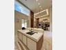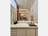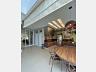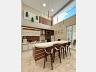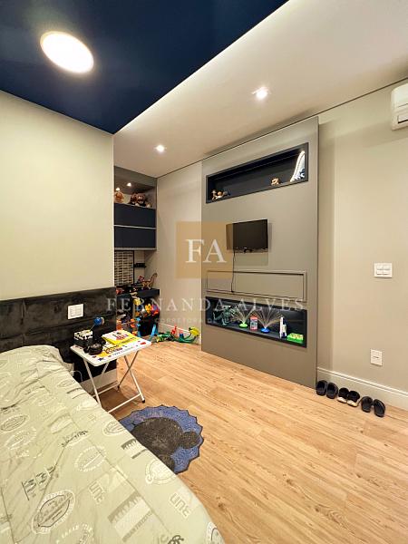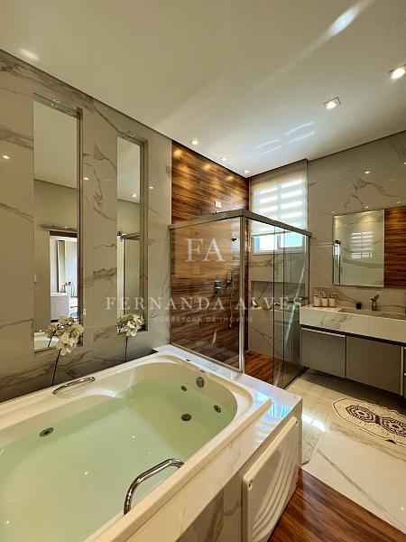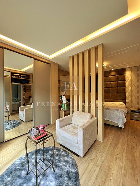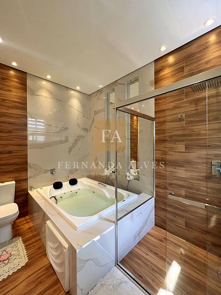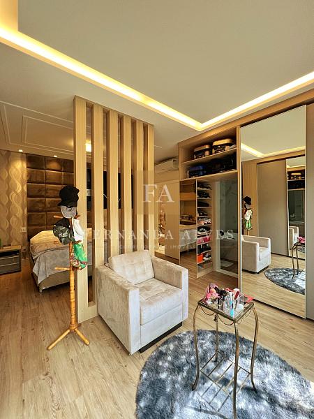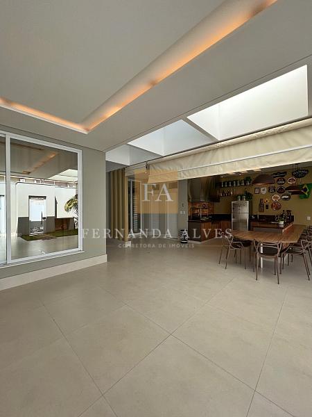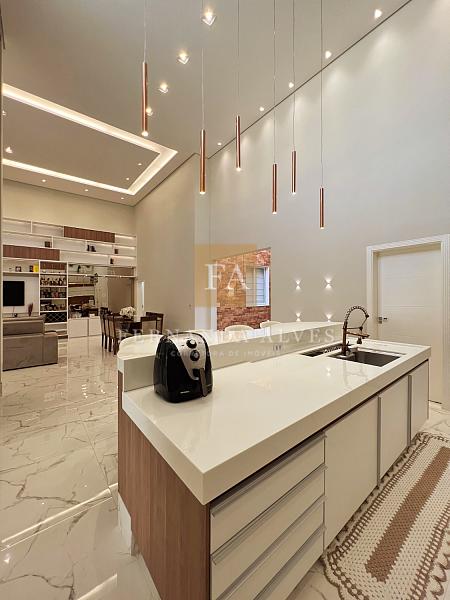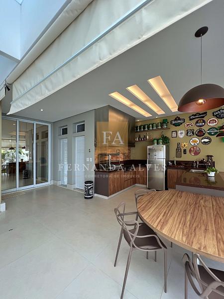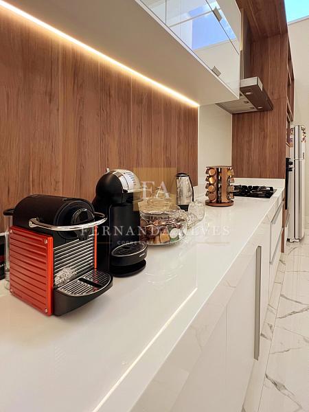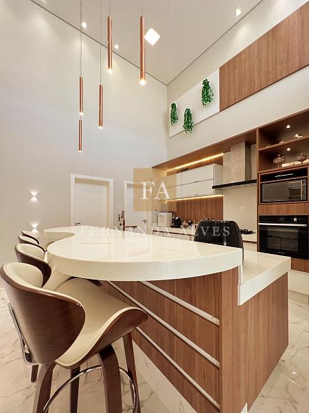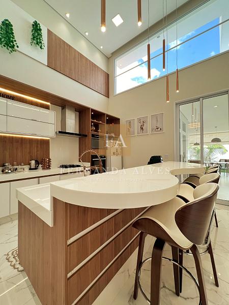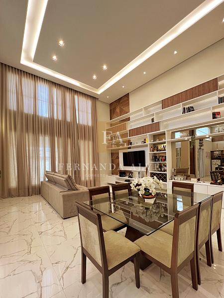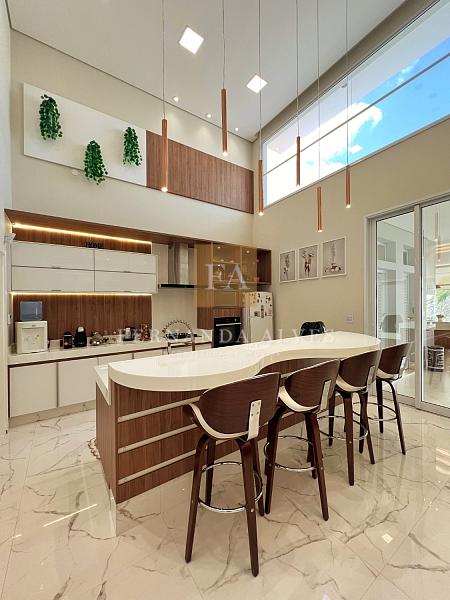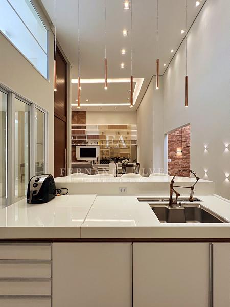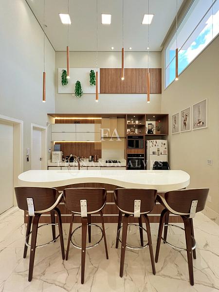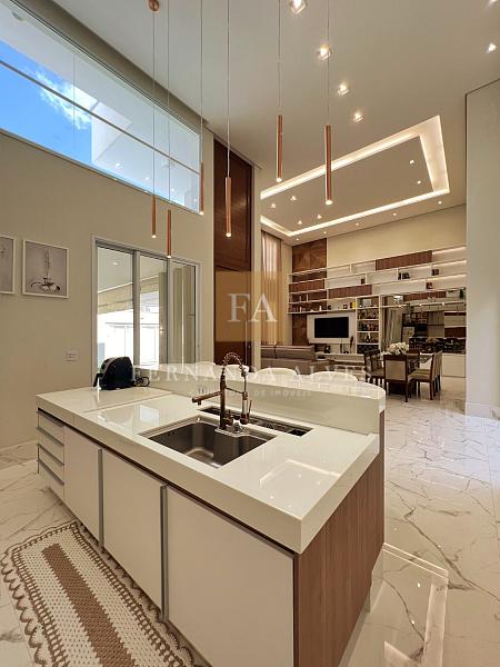 Entrando na propriedade você encontra um living com pé direito de 6 metros integrando a sala de TV e sala de jantar com a cozinha, que conta com bancadas em Nanoglass, pia com dispenser e calha úmida, geladeira, torre quente, cooktop e depurador.
