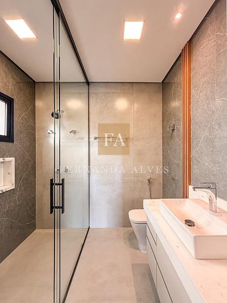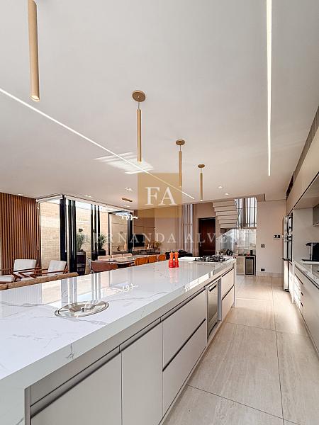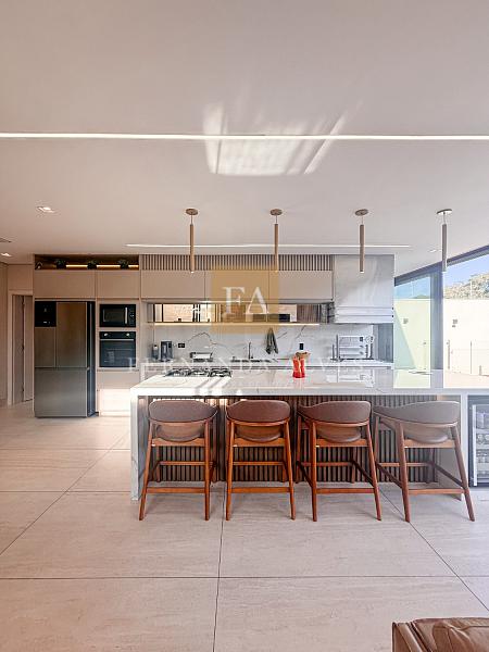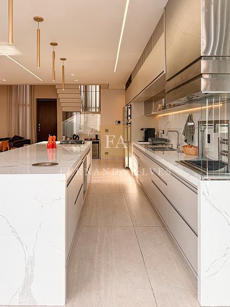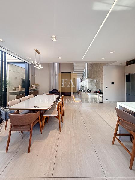 Essa Casa impressiona por seu moderno projeto, totalmente aberto, com espaços amplos e integrados com vista completa de living e área externa. Ela impressiona também por seu padrão de acabamento, muita qualidade em elementos nobres e marcenaria.