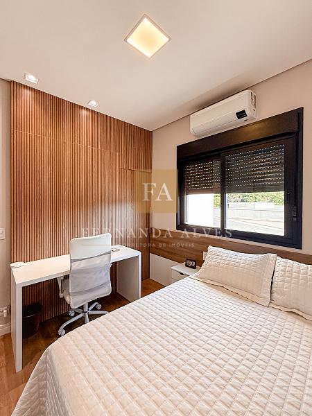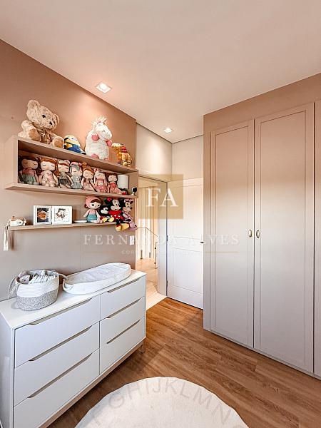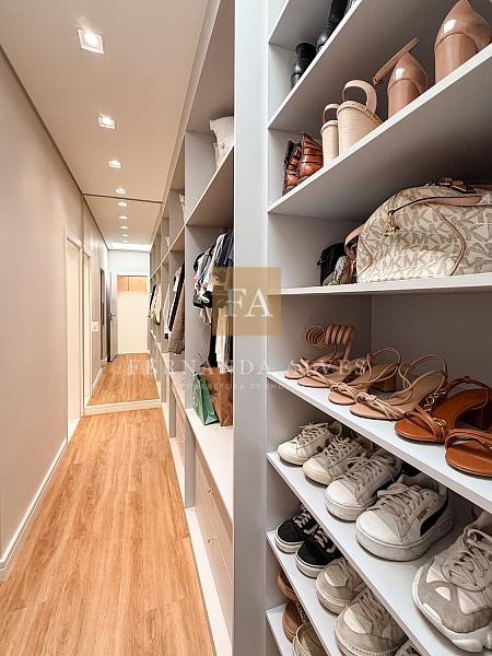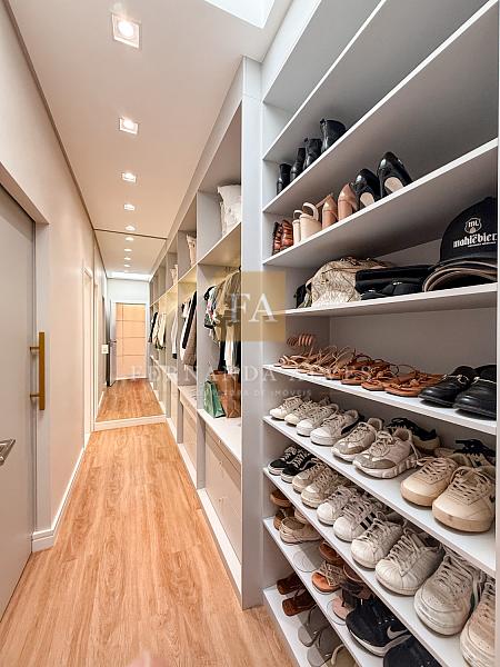No piso superior ficam os três dormitórios sendo uma suíte casal com closet e duas suítes compartilhadas, copinha e roupeiro. A suíte casal possui um projeto que oferece muita privacidade: closet e banheiro separados do espaço cama.