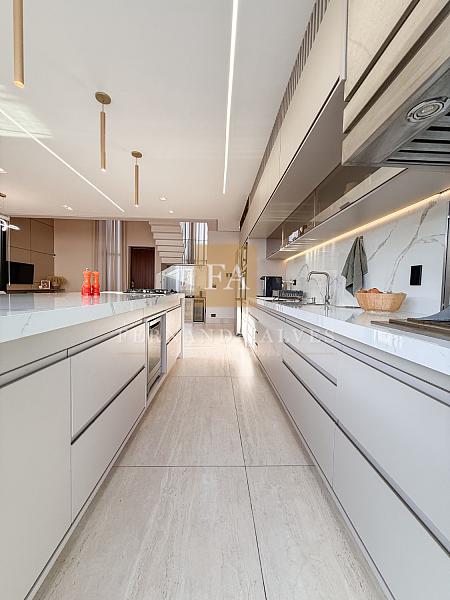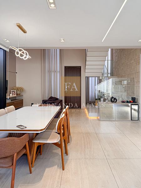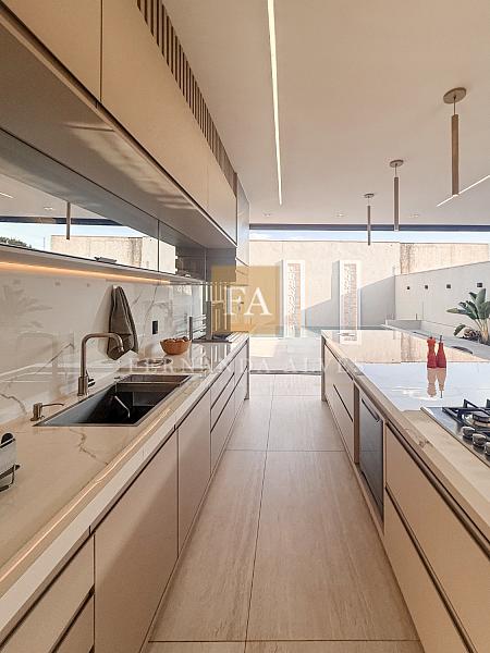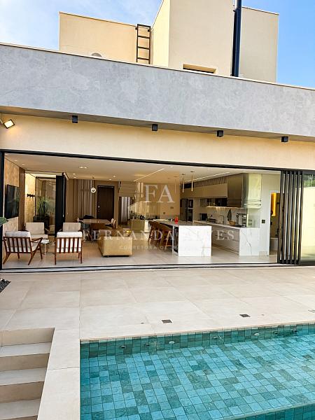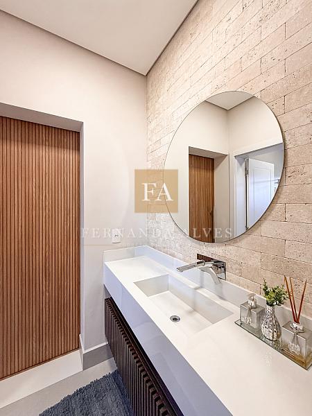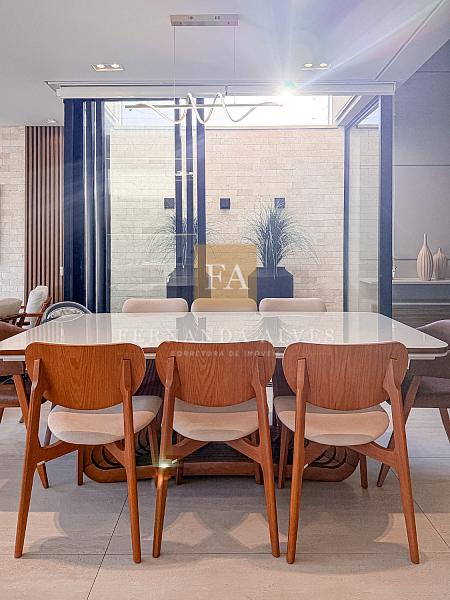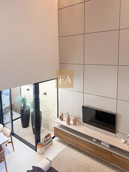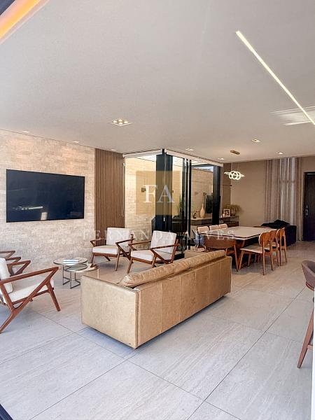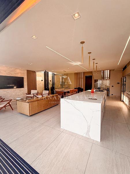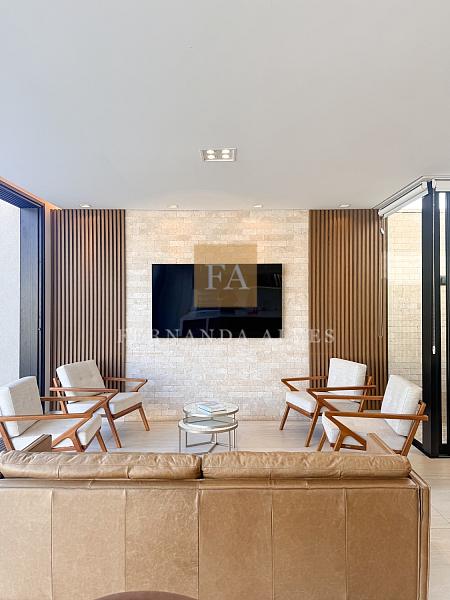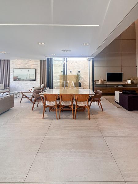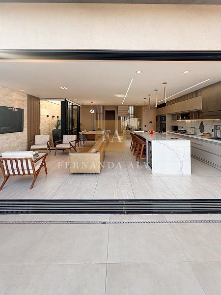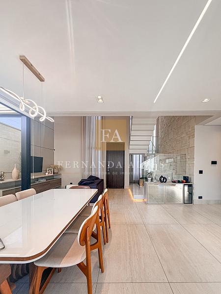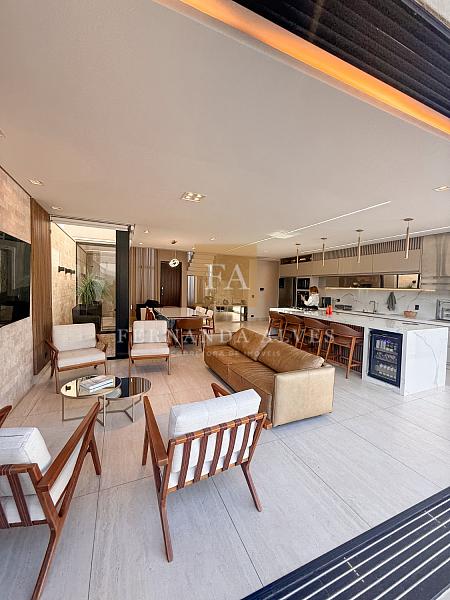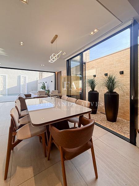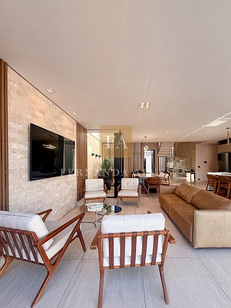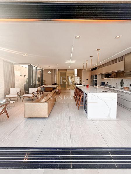 O living se conecta completamente com o quintal da casa, vista da piscina em borda infinita e espaço externo para noites do vinho. Pé direito duplo na sala de TV, espaço jantar com área de luz, sala de estar ao lado do gourmet e ampla cozinha gourmet com churrasqueira e completa para receber em casa ou simplesmente aproveitar os finais de semana em família.
