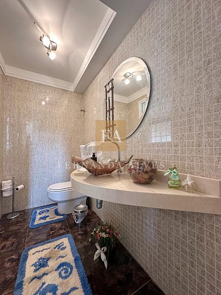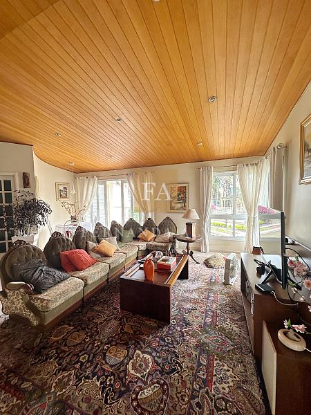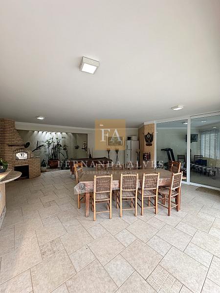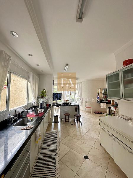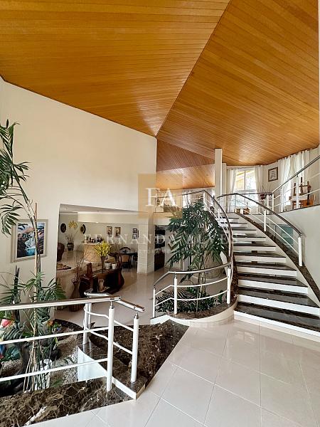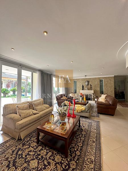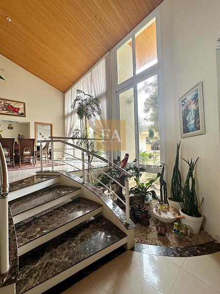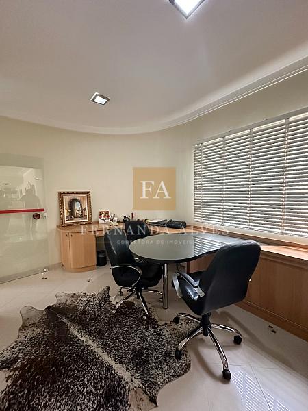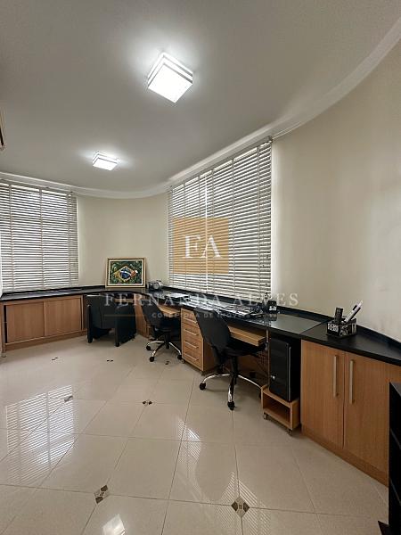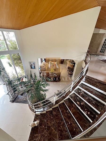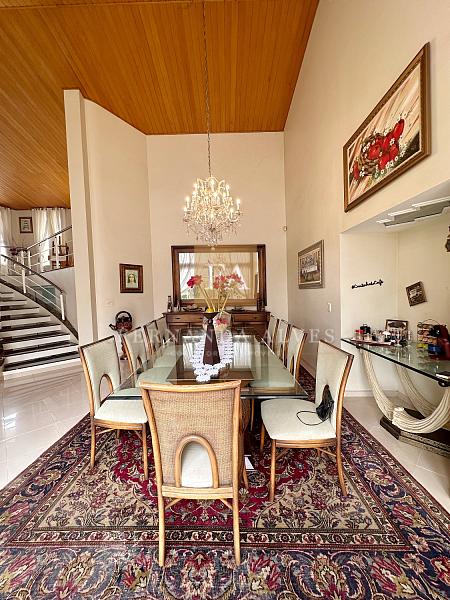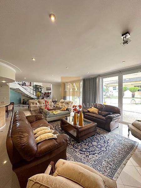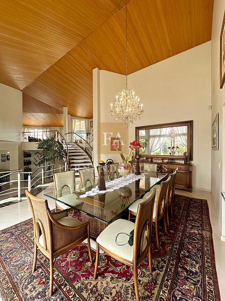 Escritório, lavabo, sala de visitas com dois ambientes e lareira, com vista para piscina, home theater com ar condicionado, projetor e telão, sala de estudos e sala de jogos com ar condicionado, sala de jantar, sala de almoço, ambas com vista para piscina, cozinha com móveis planejados, despensa, lavanderia e suíte de empregada, entrada de serviço.