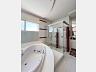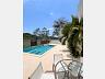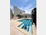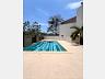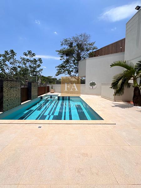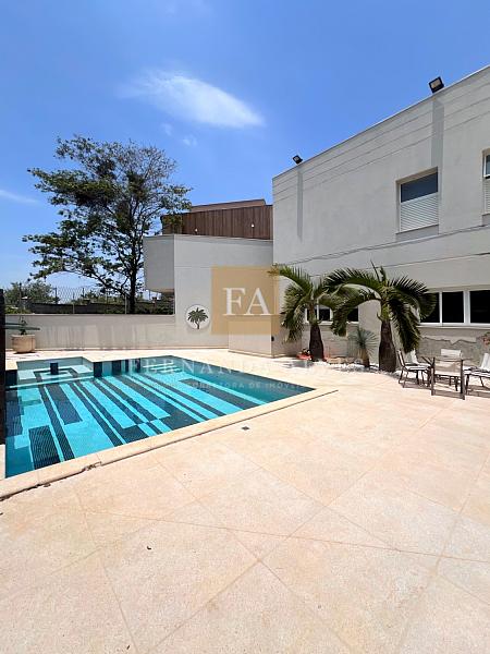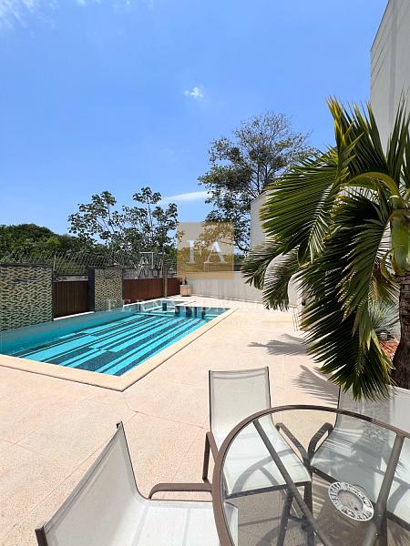 A piscina é de alvenaria, tem SPA com mesa e escada para facilitar a entrada e saída.