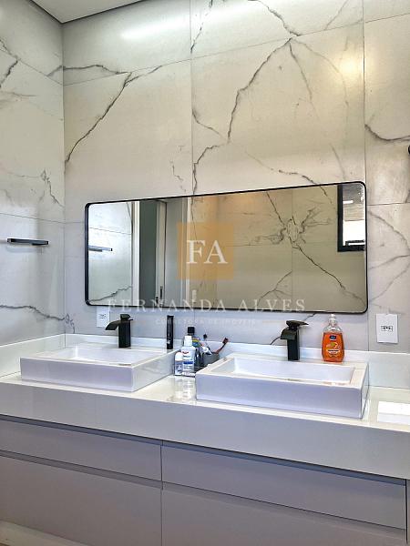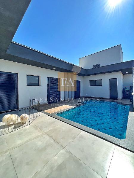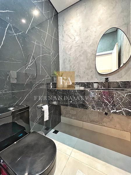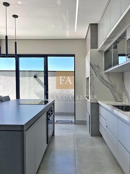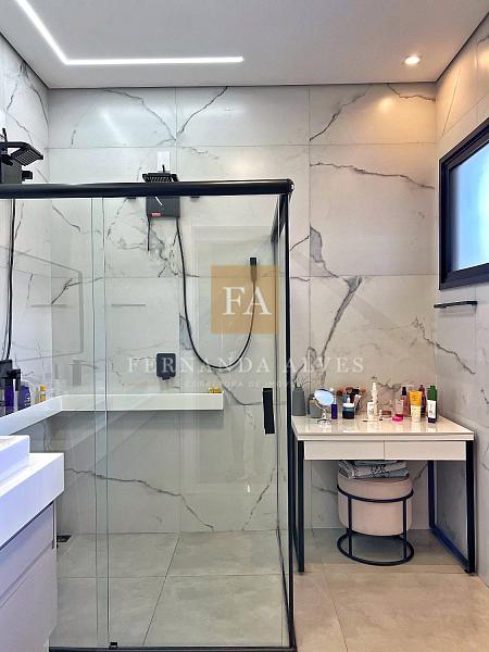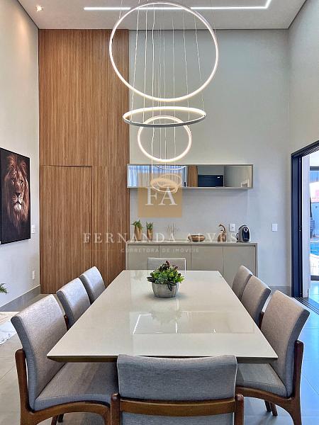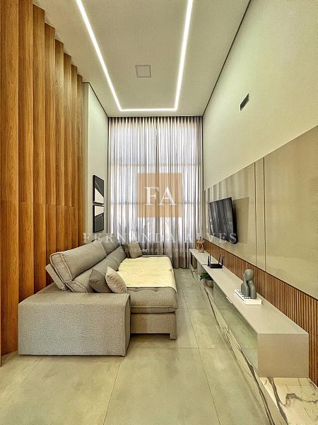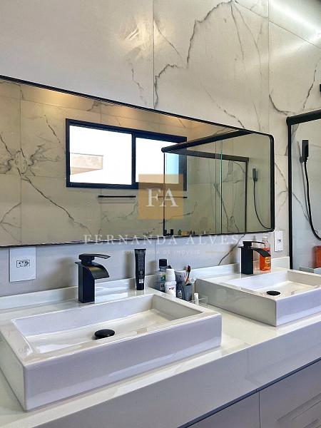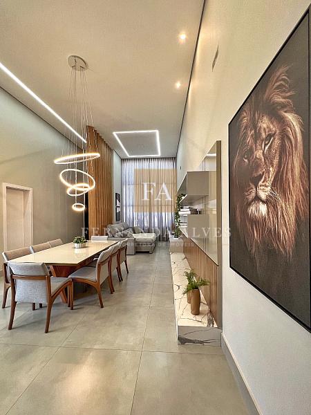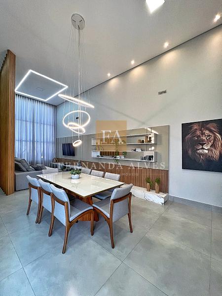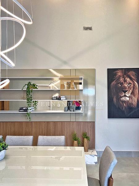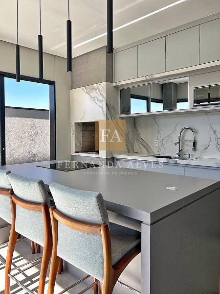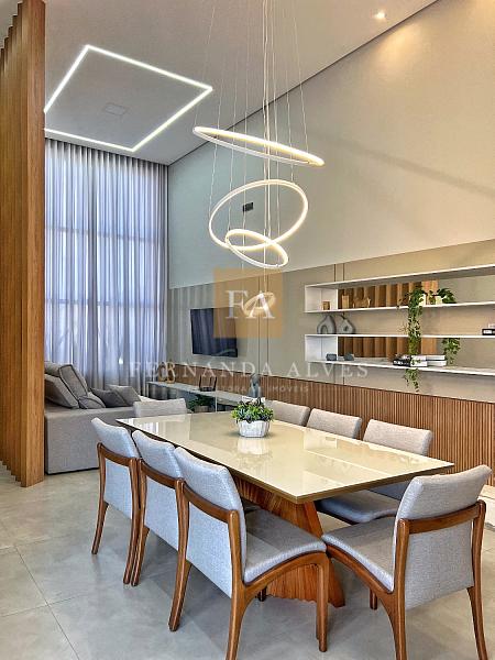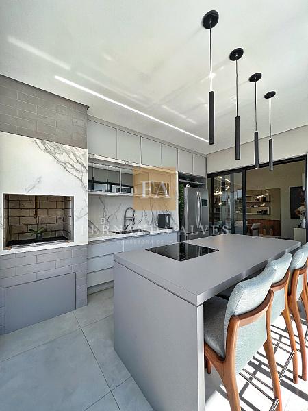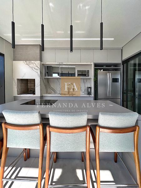 São 300 metros de lote e 200m² de construção. Fachada moderna, com detalhes em led e esquadrias pretas. Ao entrar, living de entrada, linda sala de TV, integrada com a sala de jantar e lavabo. Ambientes completos em marcenaria, com decoração moderna e imponente. A cozinha gourmet, em marmore branco, churrasqueira a carvão, completa em marcenaria e com eletrodomésticos. Ambientes fechados com esquadrias e vista para piscina.