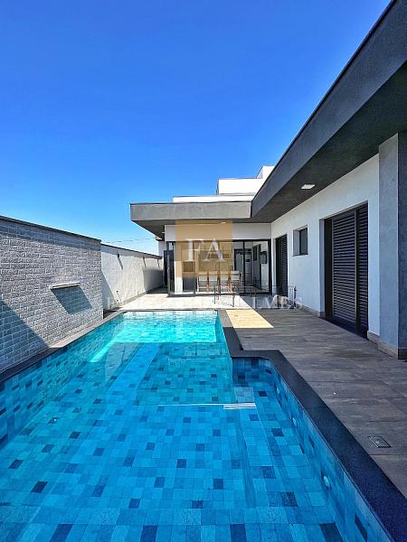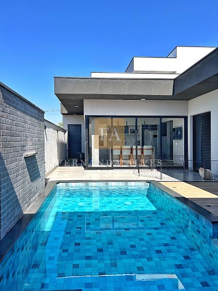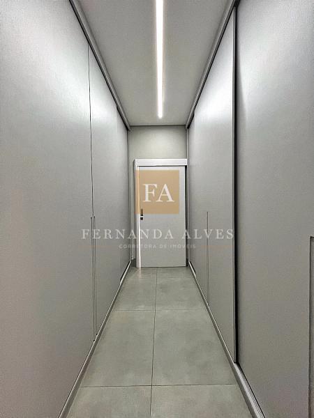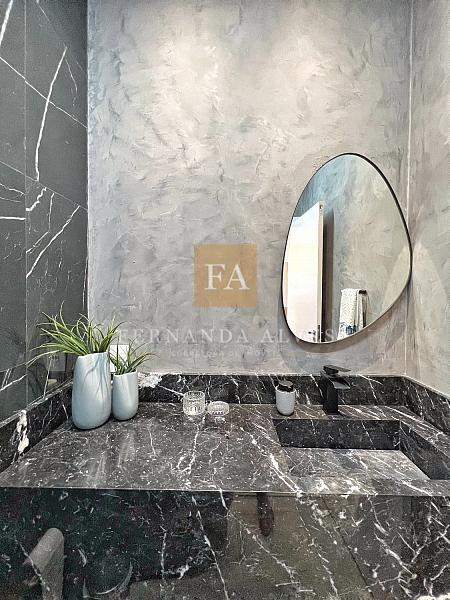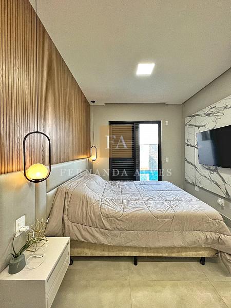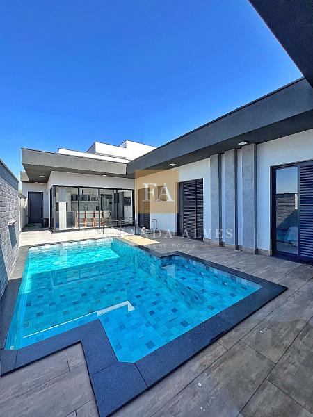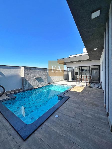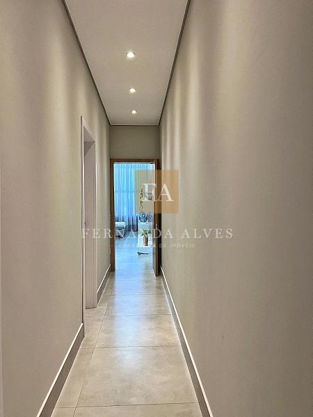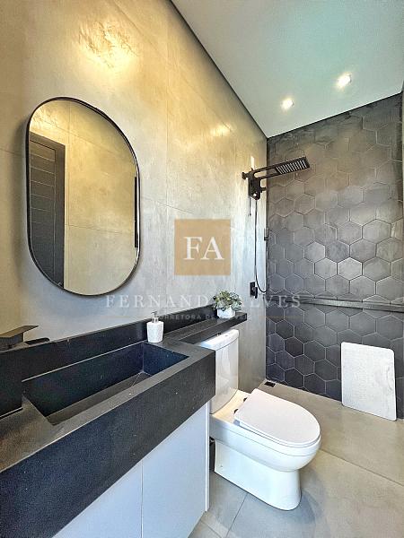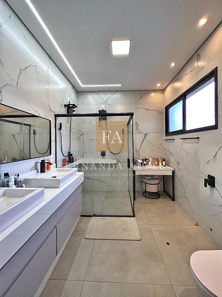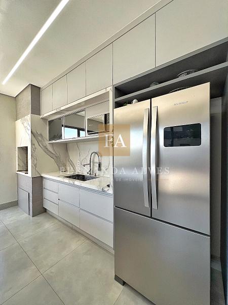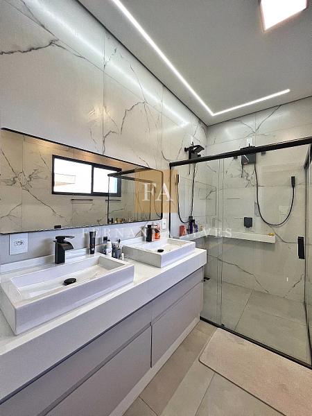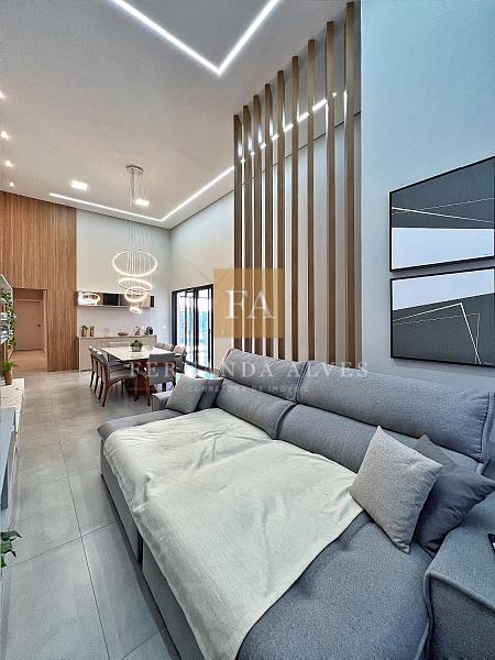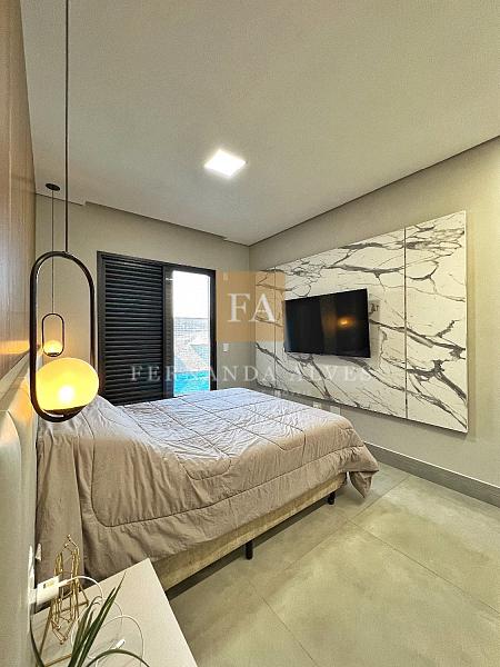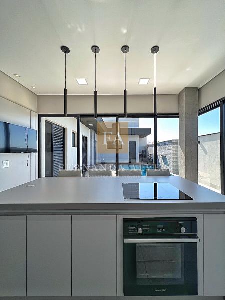 São 300 metros de lote e 200m² de construção. Fachada moderna, com detalhes em led e esquadrias pretas. Ao entrar, living de entrada, linda sala de TV, integrada com a sala de jantar e lavabo. Ambientes completos em marcenaria, com decoração moderna e imponente. A cozinha gourmet, em marmore branco, churrasqueira a carvão, completa em marcenaria e com eletrodomésticos. Ambientes fechados com esquadrias e vista para piscina.