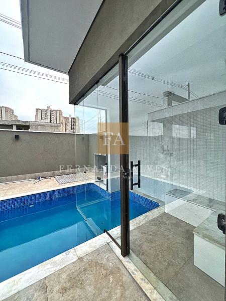 Hall de entrada, sala de Tv e jantar integrados estão climatizados, pontos de ar condicionado em todos os ambientes, lavabo social, cozinha interna e lavanderia ampla ao lado, área gourmet externa, com pia e churrasqueira a carvão e vista para piscina que tem agregado sauna úmida e banheiro externo.