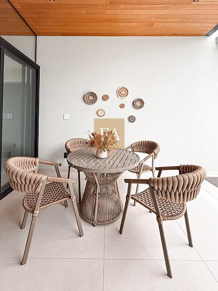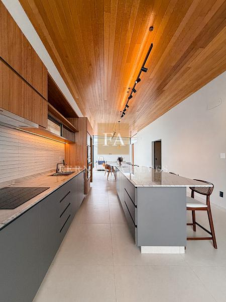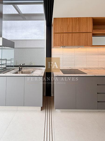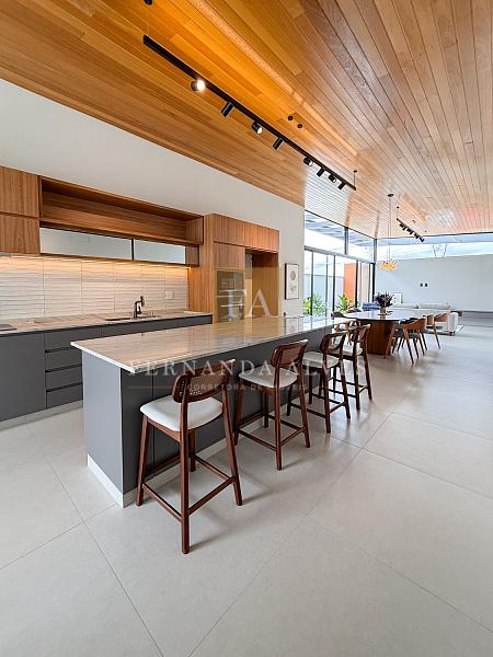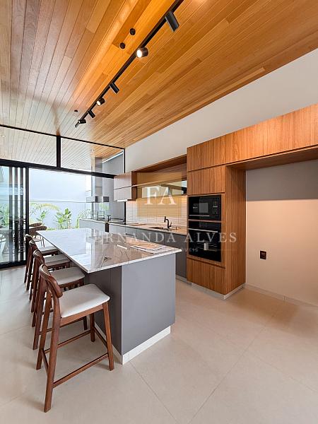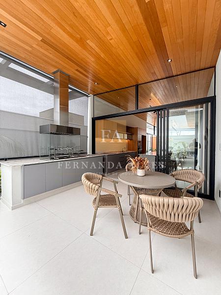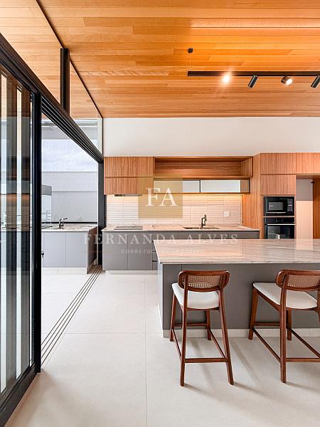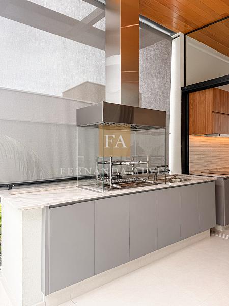 Living com sala de TV e jantar integrados a cozinha interna, ambientes já decorados e com mobiliário. O espaço gourmet fica ao lado da cozinha num projeto criado para total integração entre as bancadas e os ambientes. Churrasqueira em inox e coifa profissional. Piscina e jardim tornaram esse ambiente ainda mais leve e agradável.