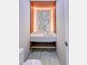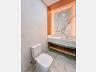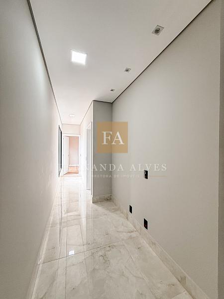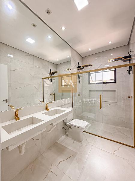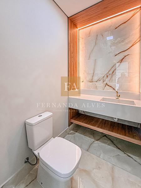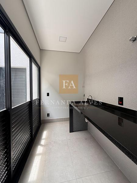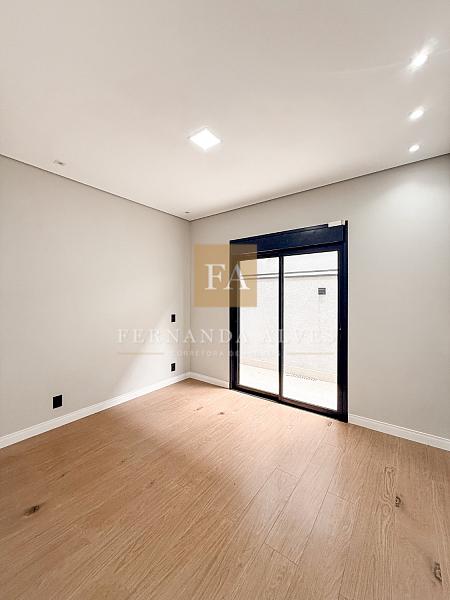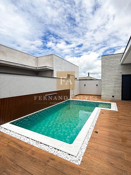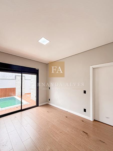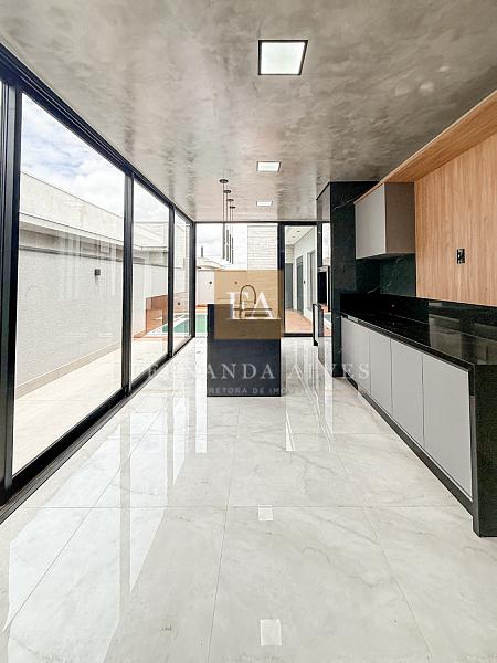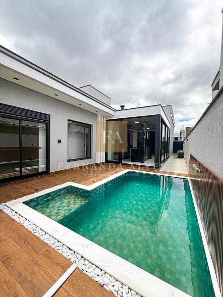Ela possui home office, espaço gourmet com portas em vidro para ser inteiramente climatizado e com vista para a piscina. Há banheiro externo para atender gourmet e piscina. A casa conta com 4 banhos e 1 lavabo interno.