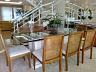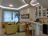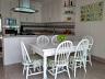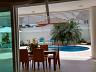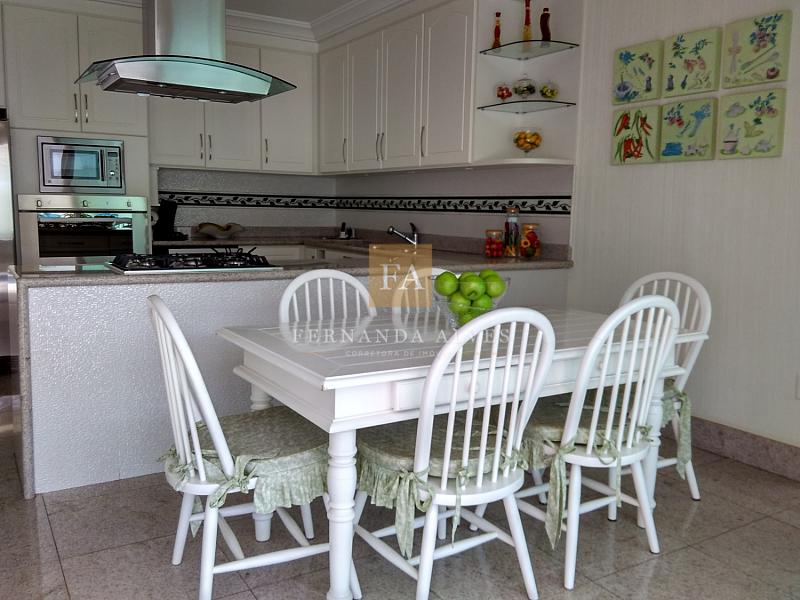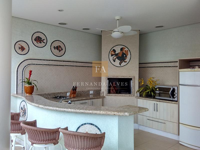 Cozinha com ilha central com vista para área gourmet e piscina que está aquecida.