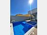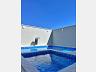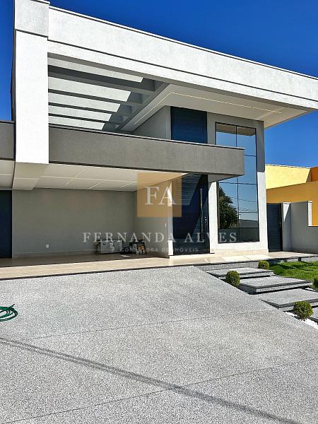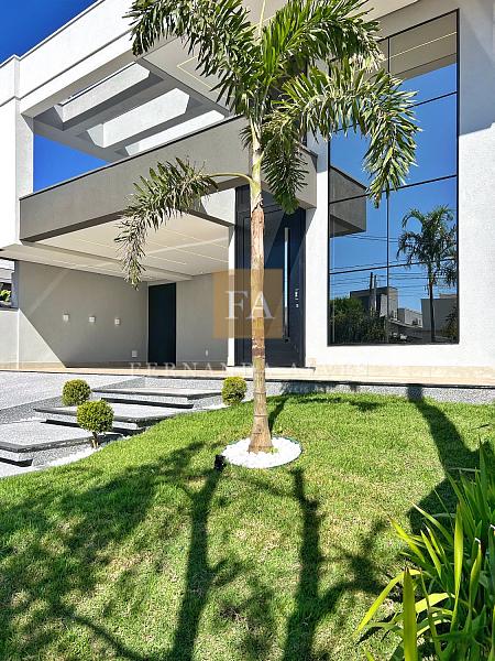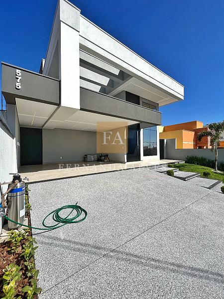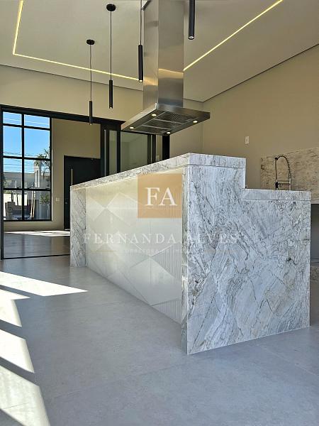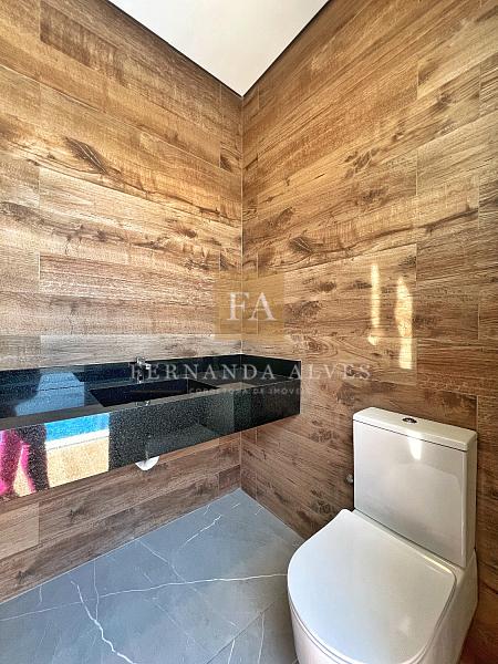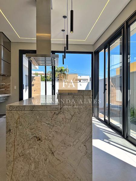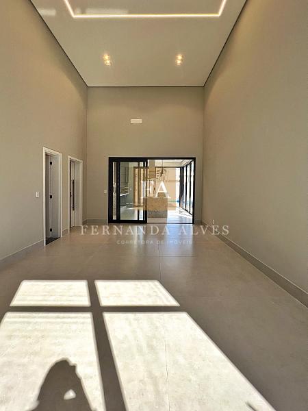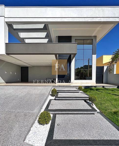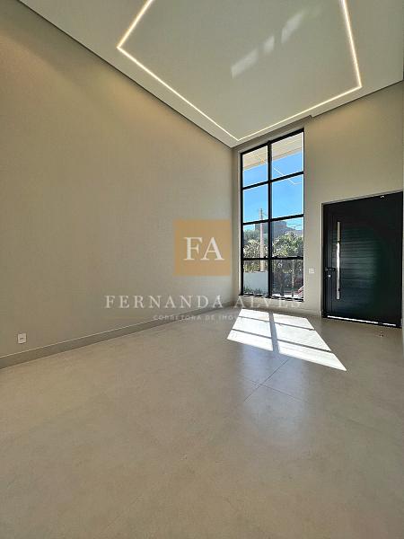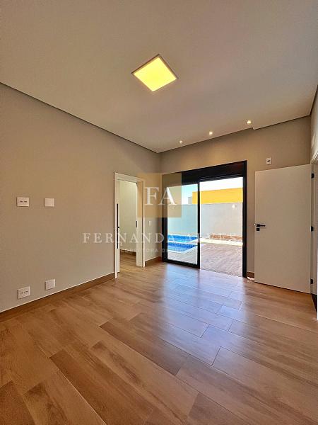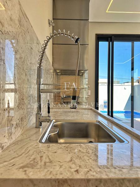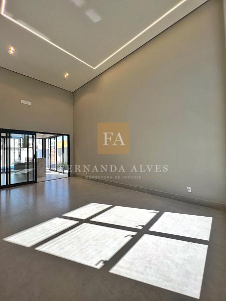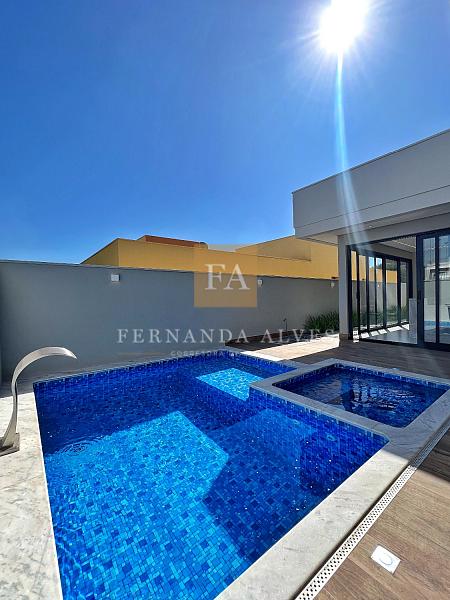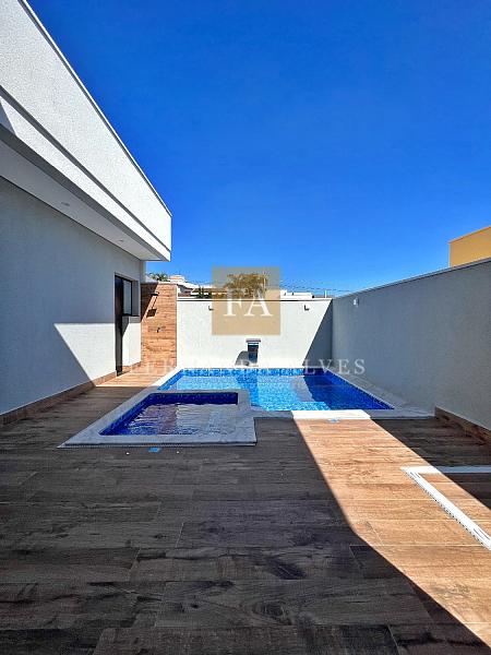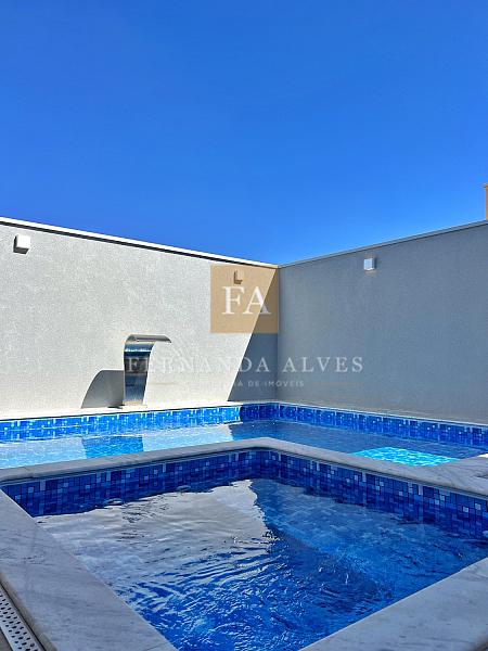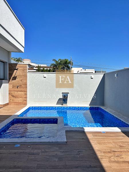 Casa térrea com pé direito alto, living dois ambientes integrados e cozinha gourmet. Área de serviço, lavabo, banheiro externo e piscina.