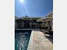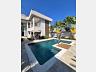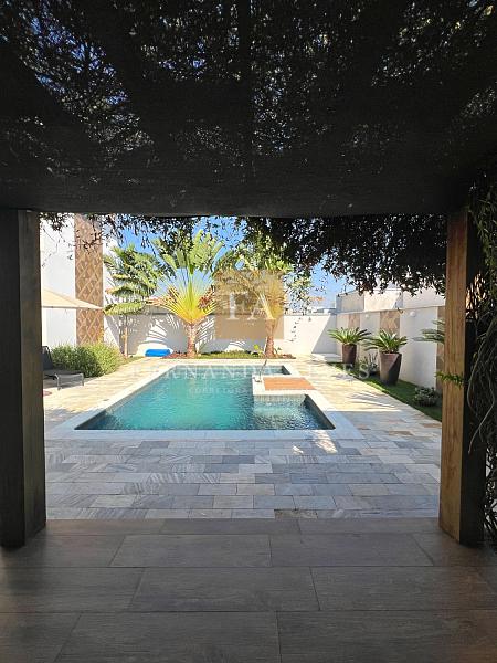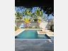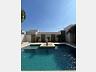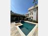 Àrea externa com muito jardim e piscina no centro, uma visão total da fachada da casa.
