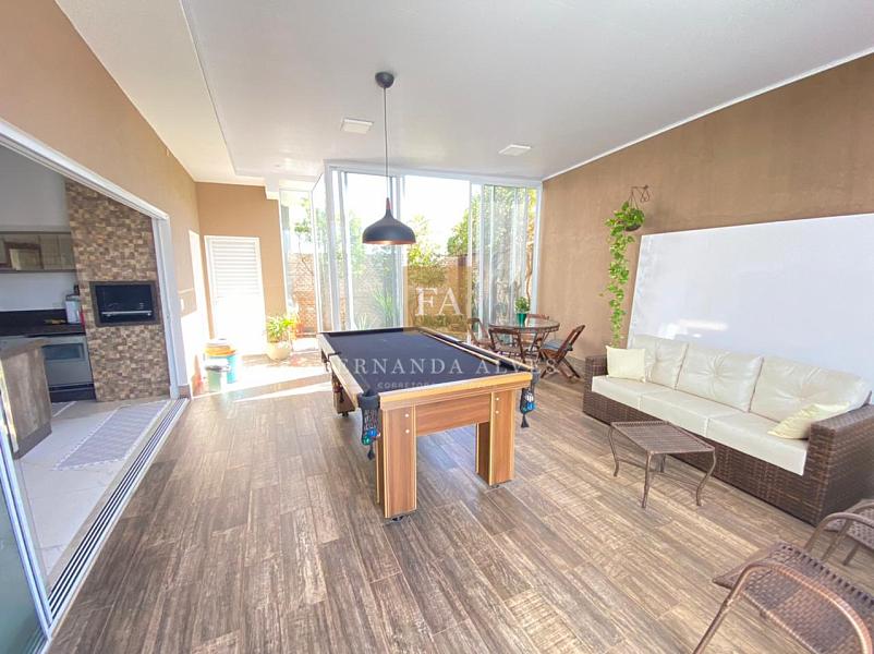 A casa é térrea com living três ambientes entre sala de visitas, sala de jantar e TV , logo ao lado fica a cozinha completa. Esse segundo ambiente se integra ao espaço gourmet que também está completo, com mesa de sinuca e mesa para jogos e possui banheiro externo.