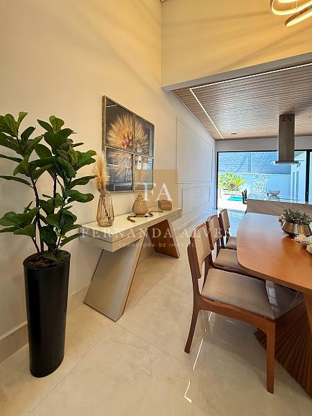 Ao entrar pela porta social, temos a integração entre a sala de TV e jantar, lavabo, cozinha gourmet com vista para a piscina.
