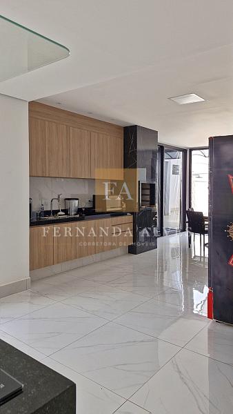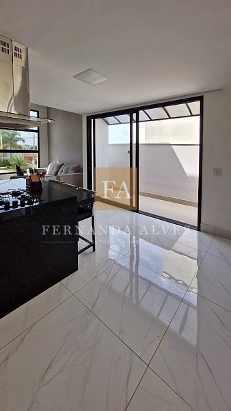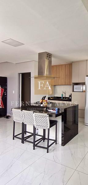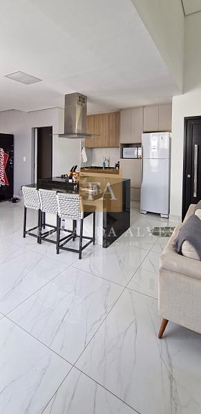 A sala espaçosa é integrada à cozinha, que conta com armários planejados, criando um espaço moderno e funcional para o dia a dia.