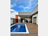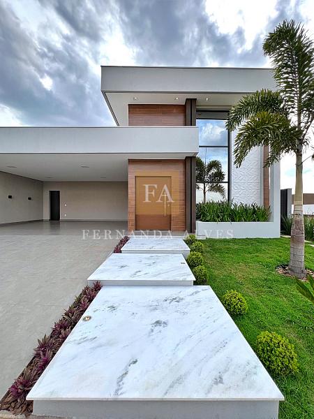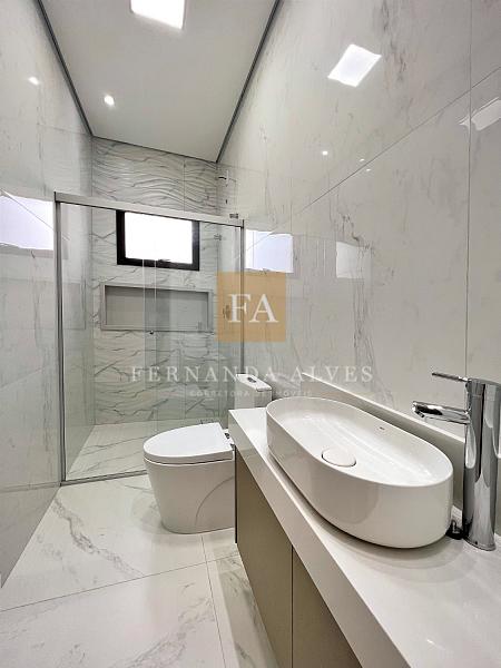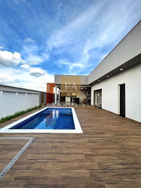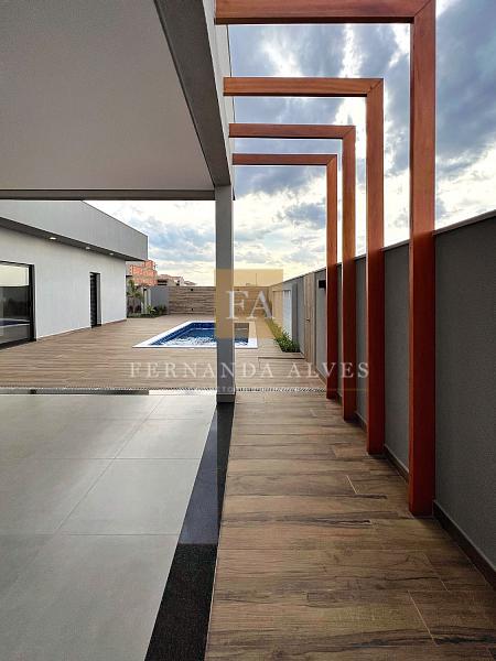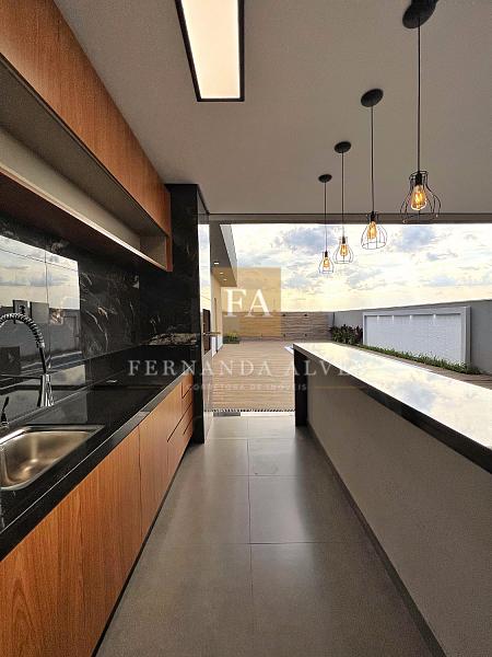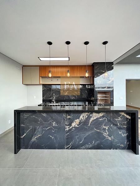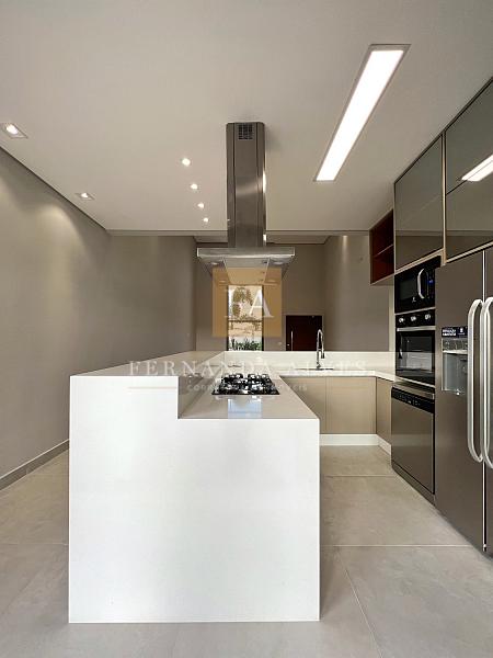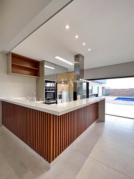 A casa é terrea com pé direito alto, ambientes integrados no living com sala de TV e jantar junto á cozinha que está completa em armários e eletrodomésticos como geladeira side by side, lava-louças, cooktop, coifa, forno e microondas, ao lado, uma despensa de alimentos.