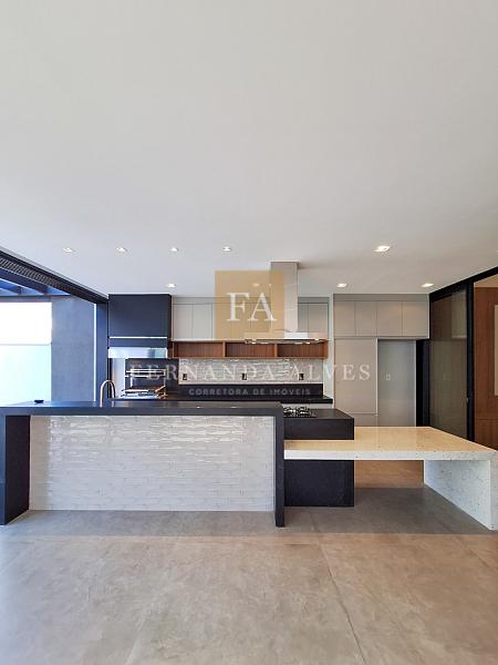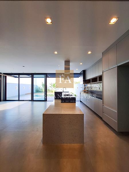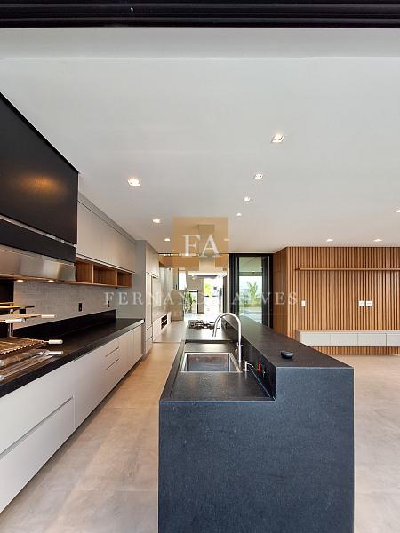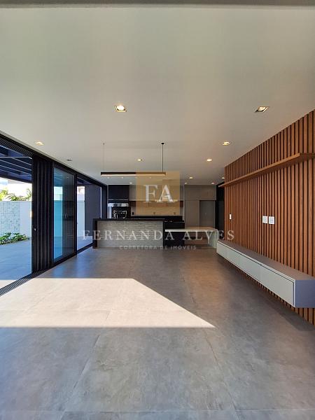 O living possui pé-direito alto, painel de TV com rack e integração total à área gourmet, que conta com marcenaria completa. Ao lado, um ambiente exclusivo para sala de TV oferece vista privilegiada para a área externa. O lazer é um destaque à parte: espaço amplo, com paisagismo elaborado, piscina em alvenaria e cascata.
