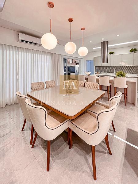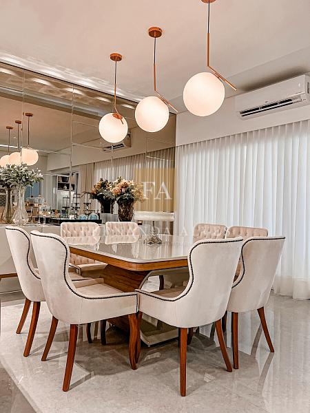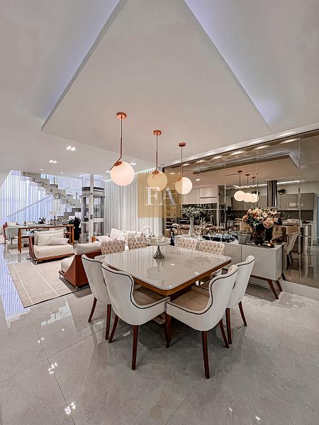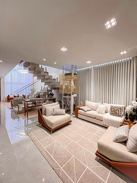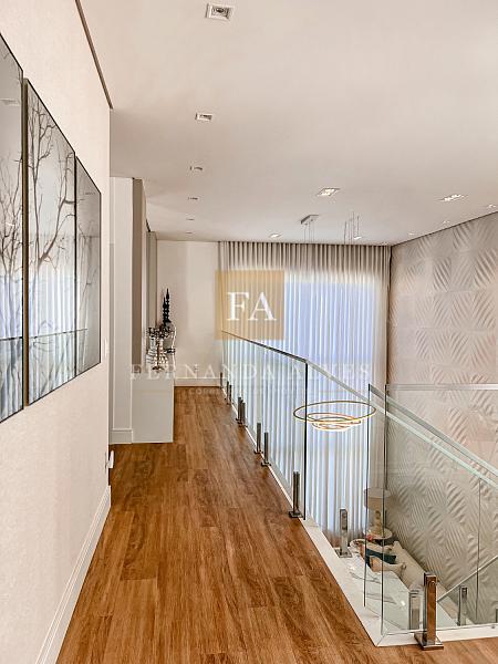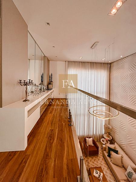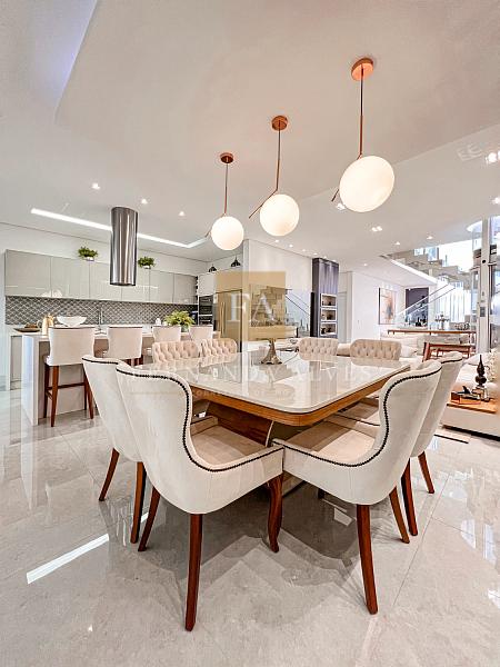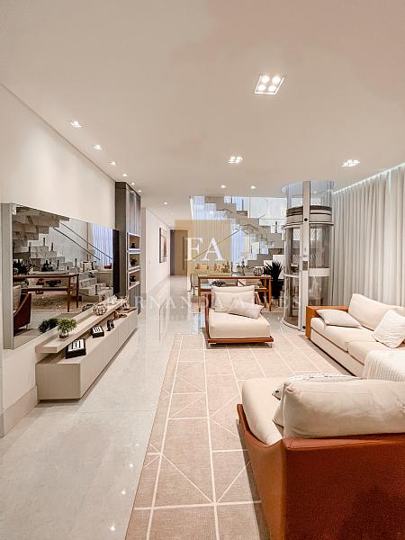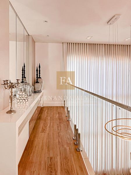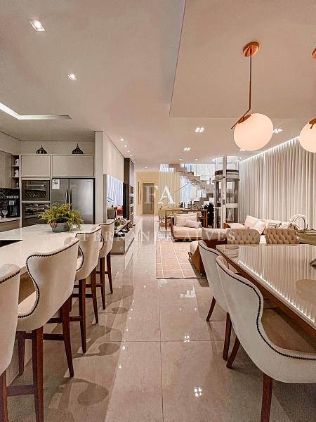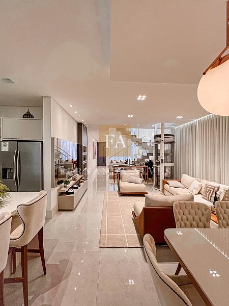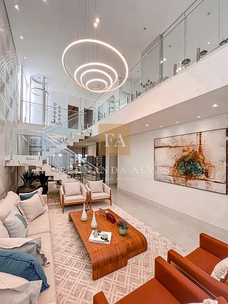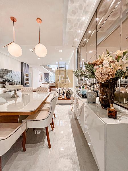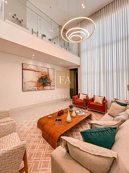 Uma Casa lindamente decorada, com dois andares e um belo mezanino no espaço social. O living três ambientes oferece uma espaçosa sala de visitas, uma segunda e linda sala com TV ao lado do espaço jantar, todos os ambientes ficam integrados á cozinha num conceito aberto e amplo. Ainda no piso térreo, há um espaço office e lavabo.