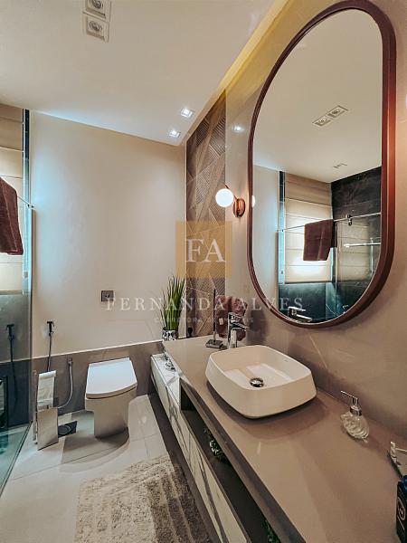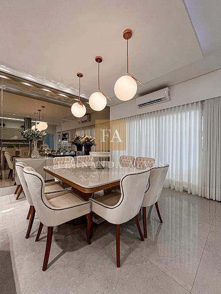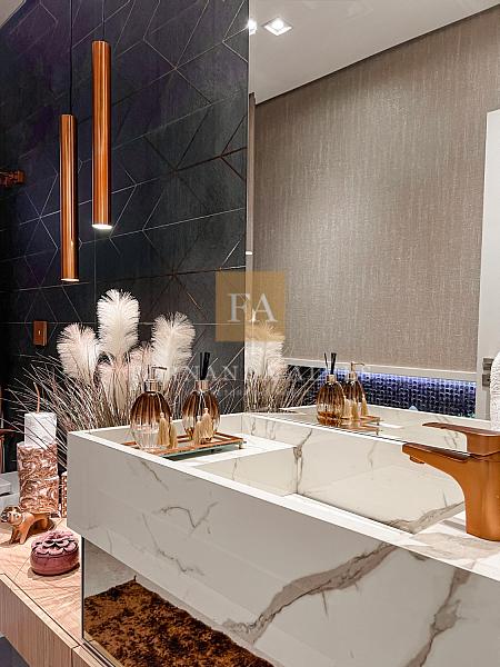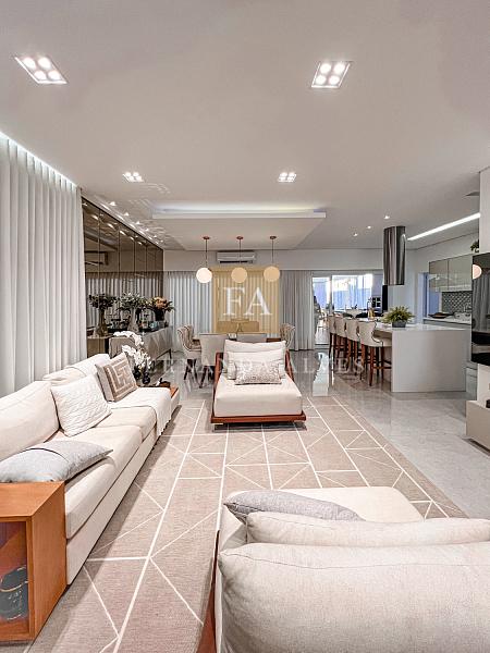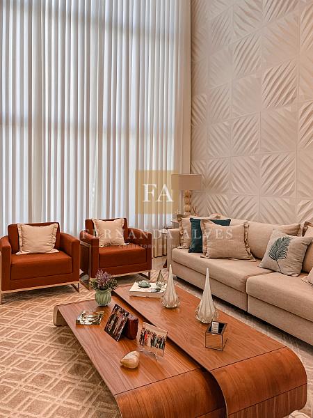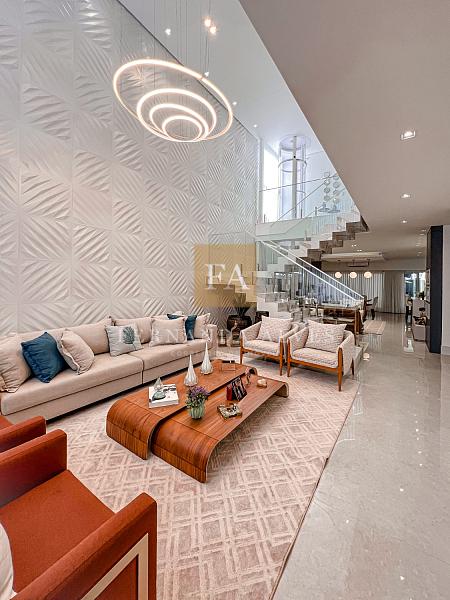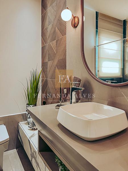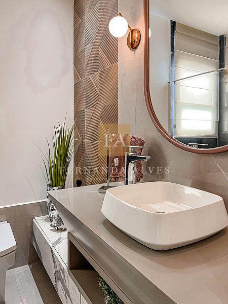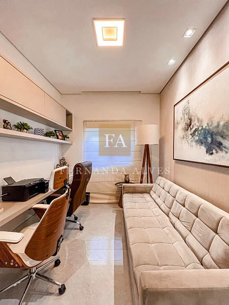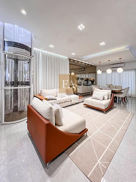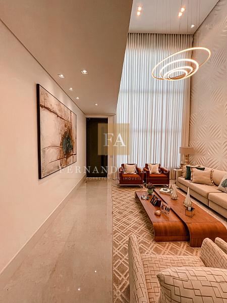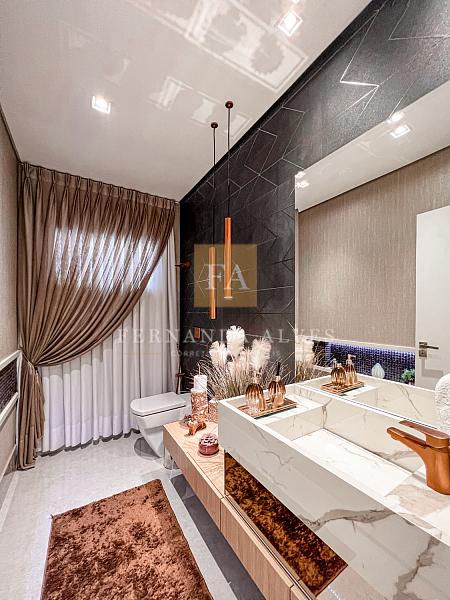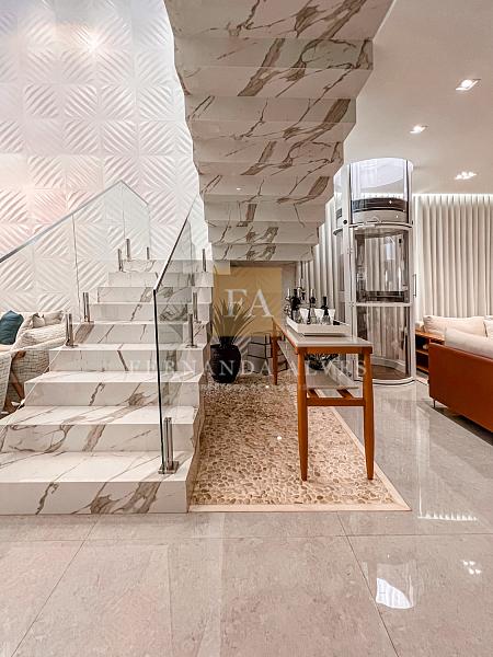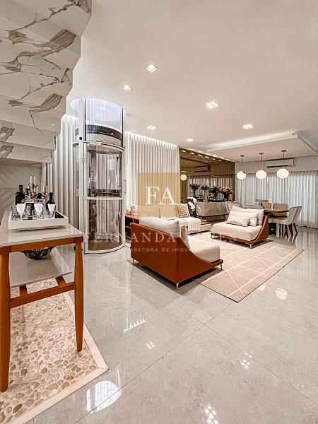 Uma Casa lindamente decorada, com dois andares e um belo mezanino no espaço social. O living três ambientes oferece uma espaçosa sala de visitas, uma segunda e linda sala com TV ao lado do espaço jantar, todos os ambientes ficam integrados á cozinha num conceito aberto e amplo. Ainda no piso térreo, há um espaço office e lavabo.