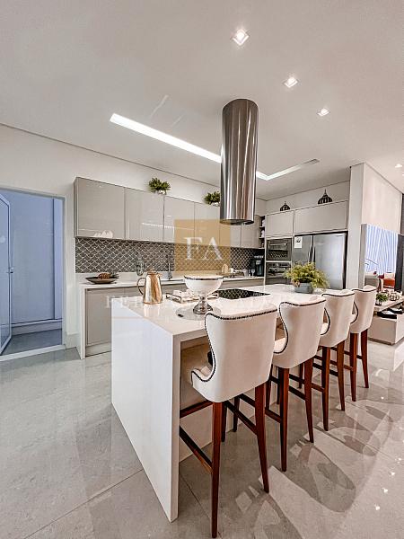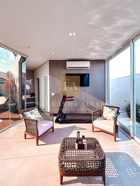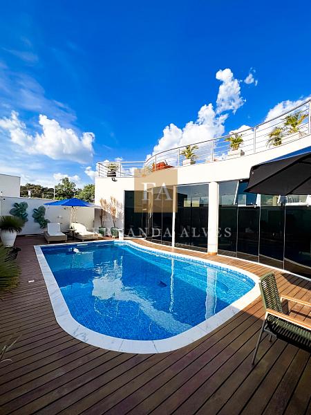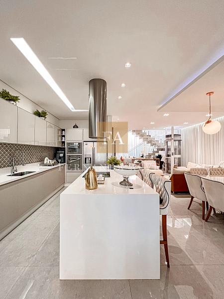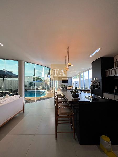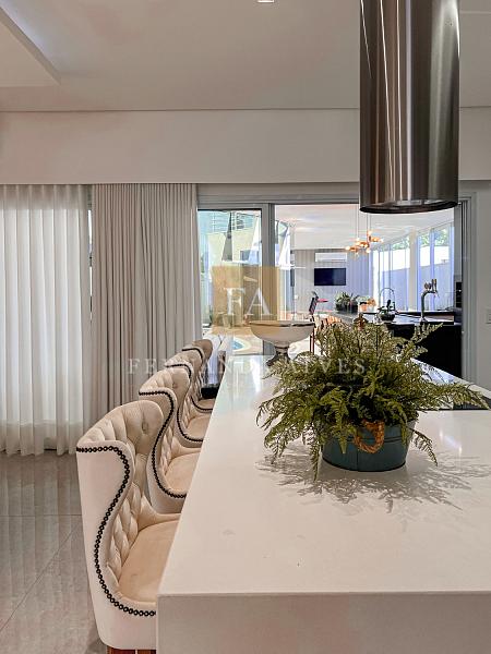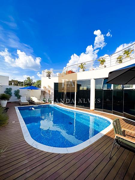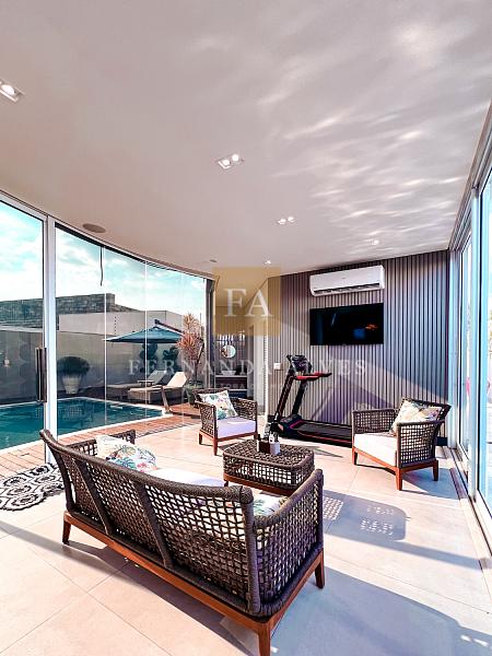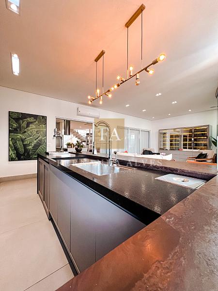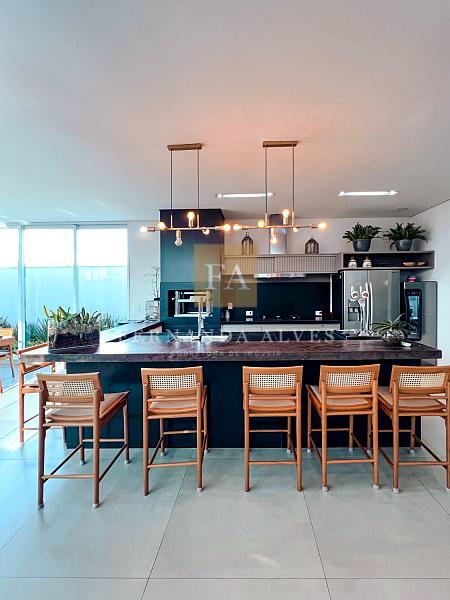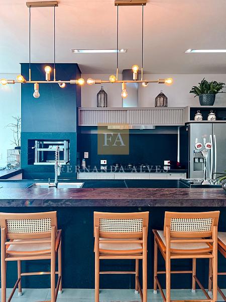 O espaço gourmet da casa é um show a parte, muito amplo, também com três ambientes: estar com cristaleira, espaço almoço e estar próximo á piscina. Um extensa bancada com chopeira, churrasqueira a carvão, refrigerador e cervejeira, ambiente todo climatizado e completo em marcenaria, ainda oferece depósito e banheiro da piscina. Linda piscina aquecida e com mobiliário externo.