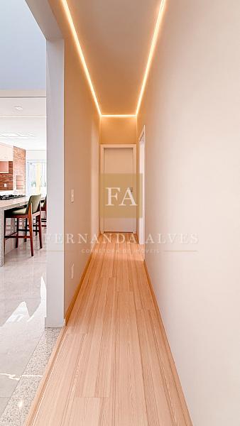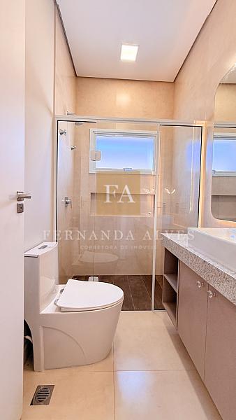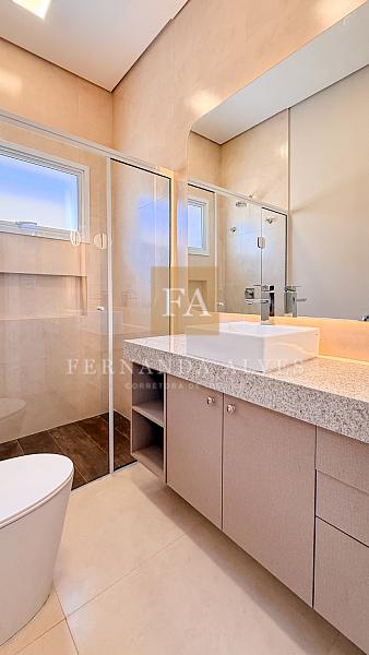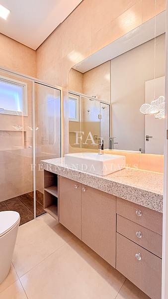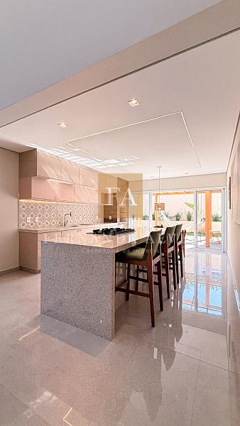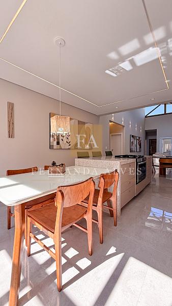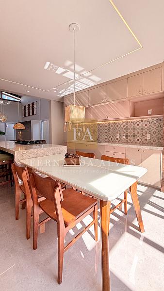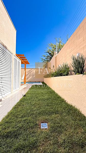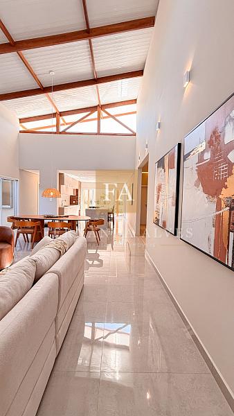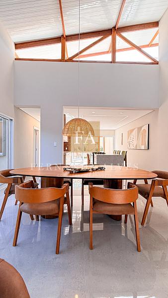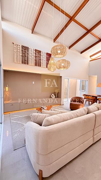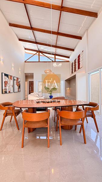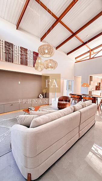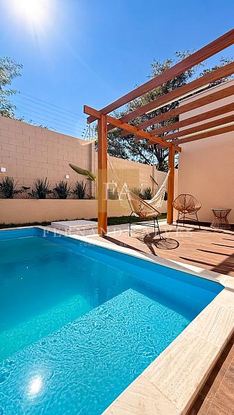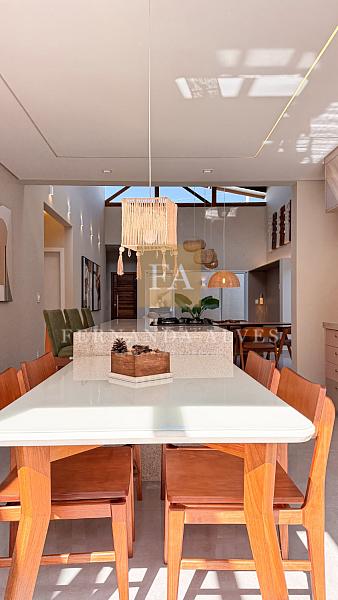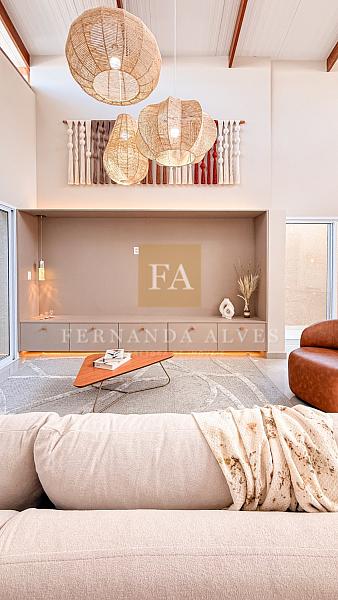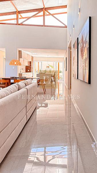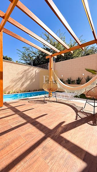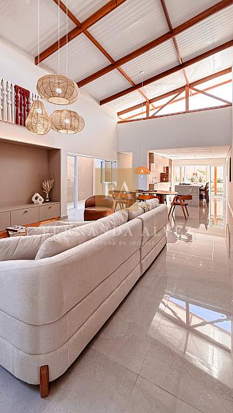 A casa é térrea, com hall de entrada, amplo living com sala de TV e jantar integrados ao gourmet, escritório, 3 suítes, closet, lavanderia interna, banaheiro da piscina, piscina e área externa com redário, jardim e depósitos.