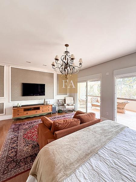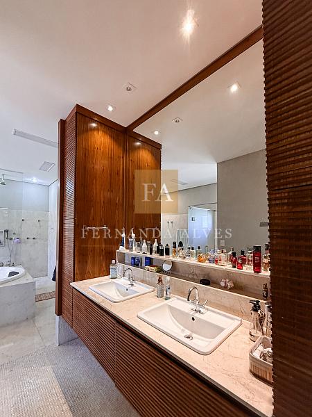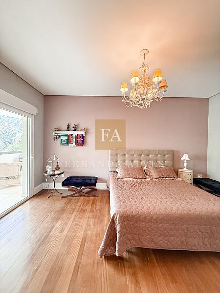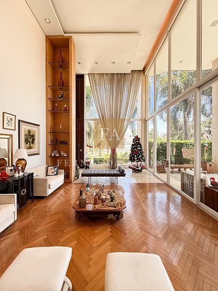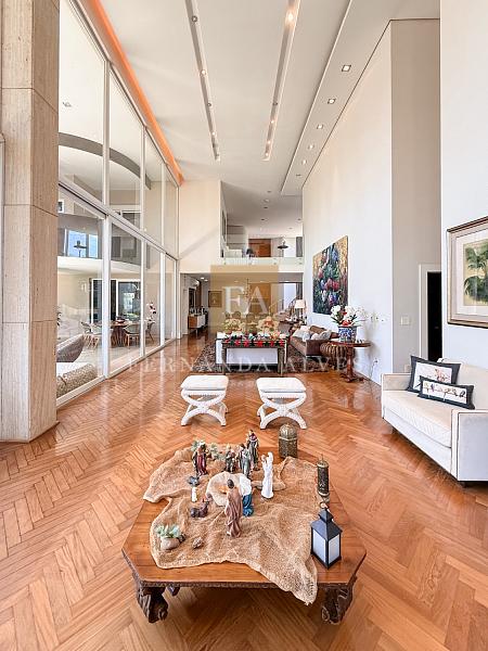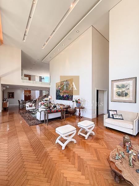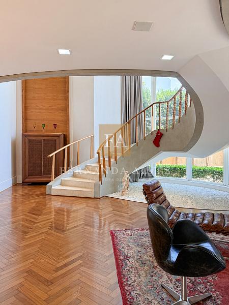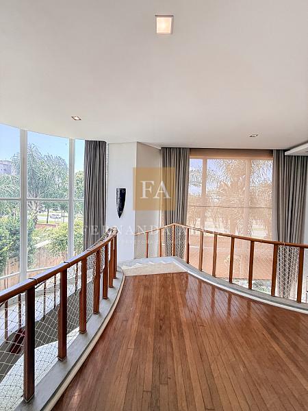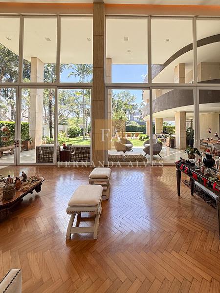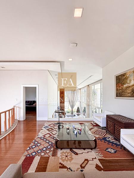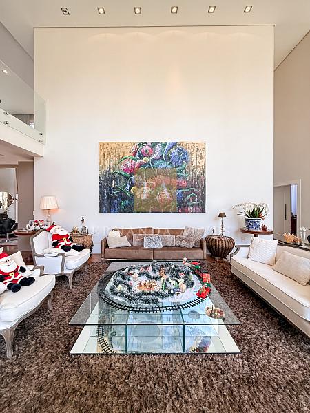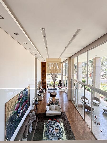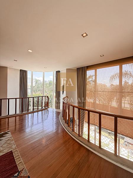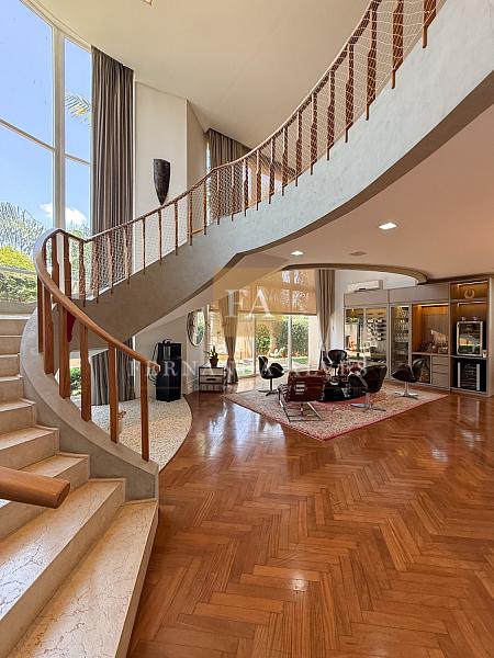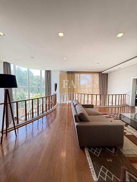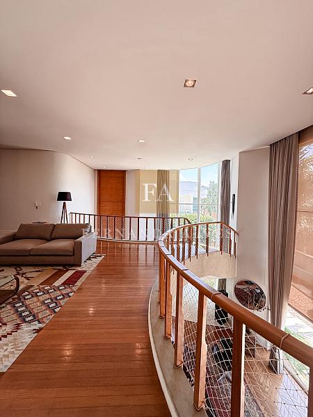 Piso superior: escadas em madeira e mármore, sala íntima com vista do mezanino de 7 metros, sala de TV, 4 suítes sendo a principal com um super closet e todas com varandas e vista do jardim.