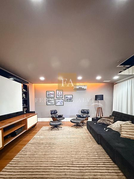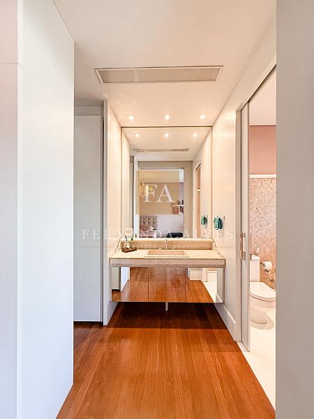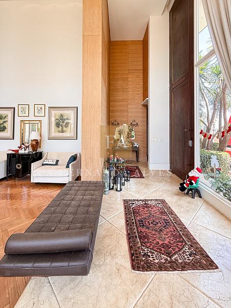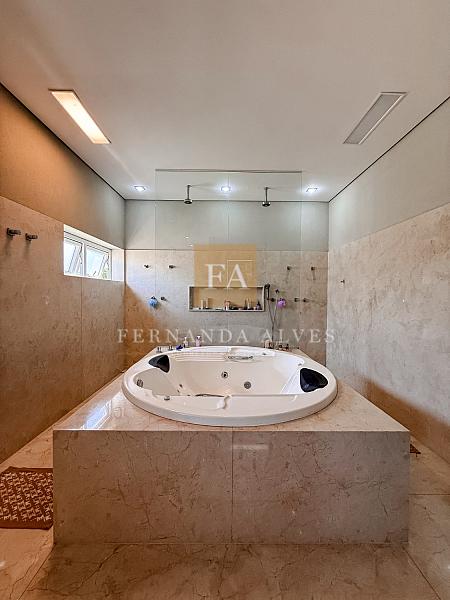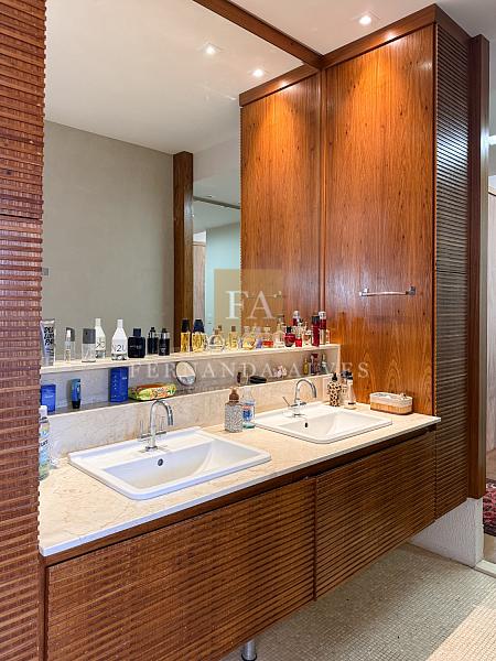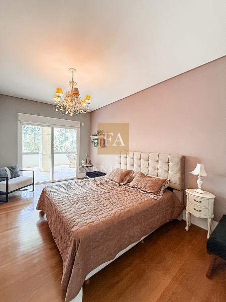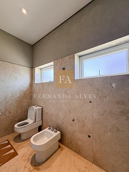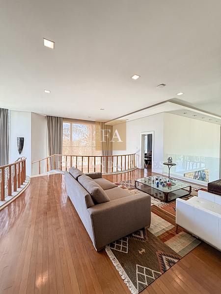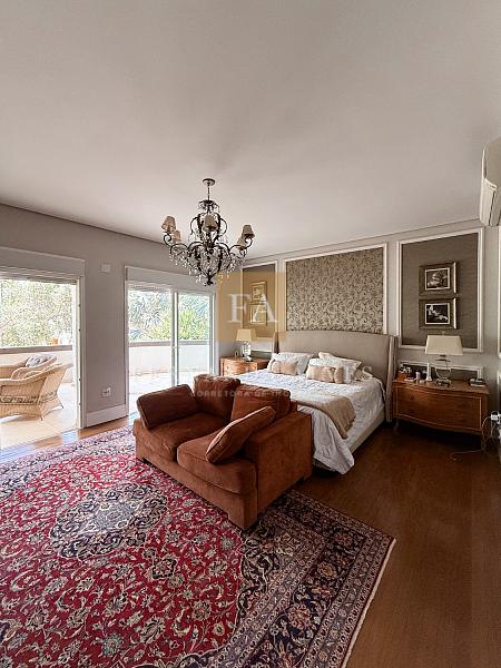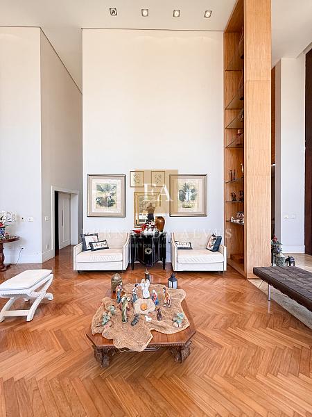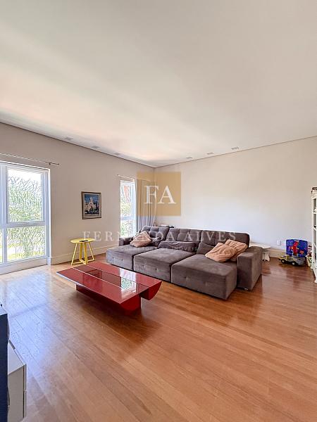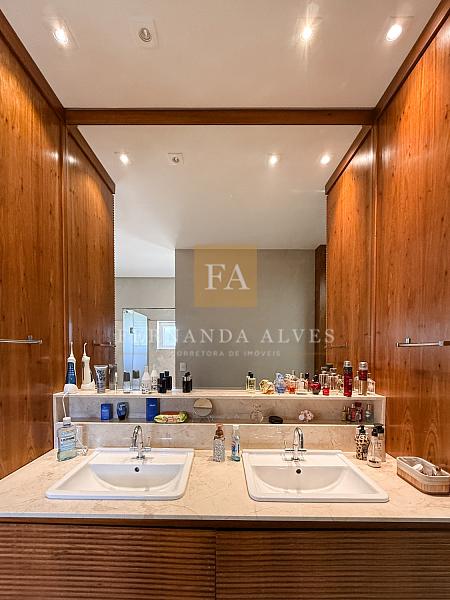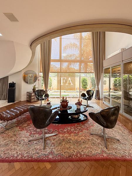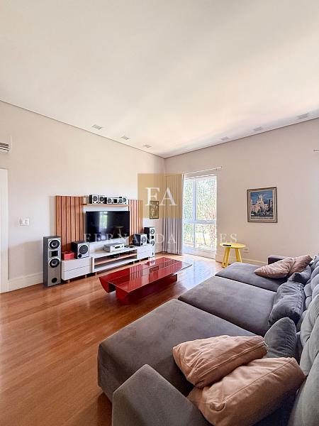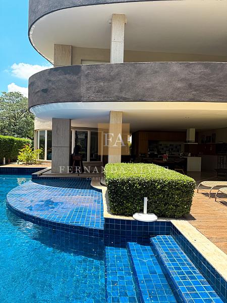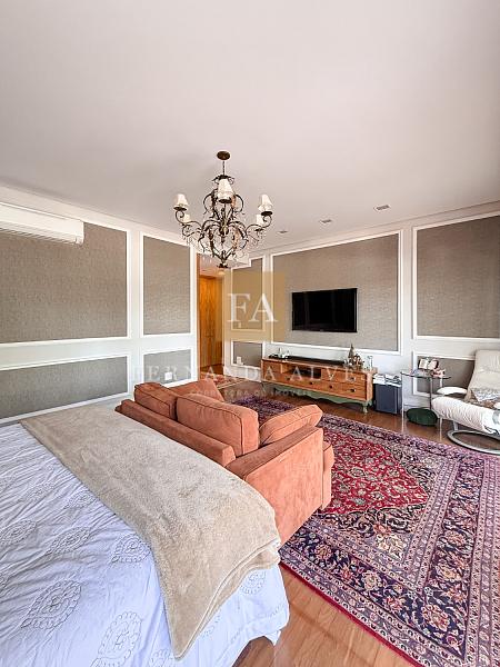 Piso superior: escadas em madeira e mármore, sala íntima com vista do mezanino de 7 metros, sala de TV, 4 suítes sendo a principal com um super closet e todas com varandas e vista do jardim.
