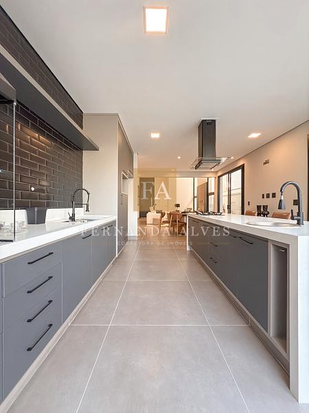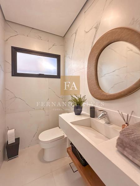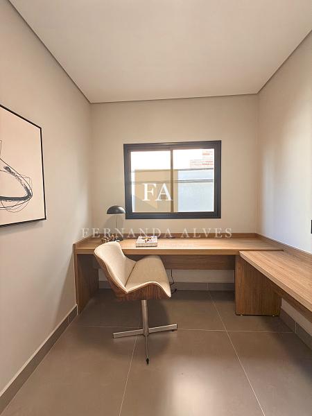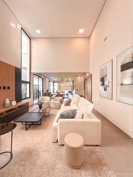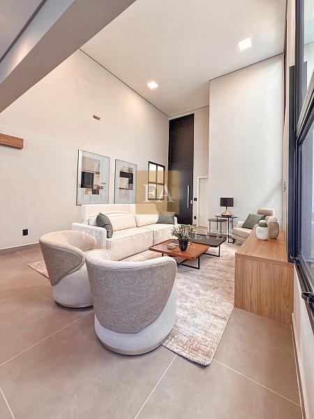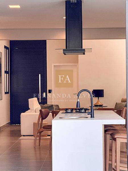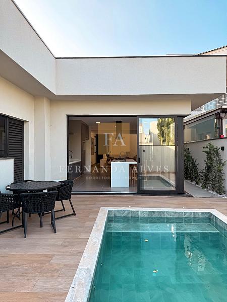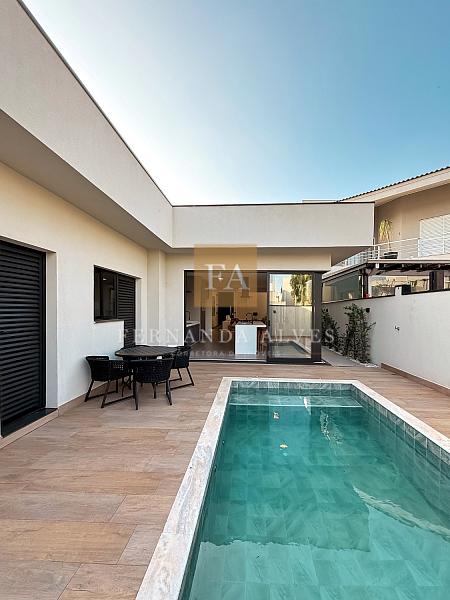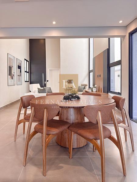 Casa térrea, com uma arquitetura moderna e imponente, tooda mobiliada e decorada. Fachada com detalhes em ripado, lindo paisagismo e pé direito alto. Ao entrar um escritório, com lavabo ao lado, uma bela vista dos ambientes integrados sendo sala de TV, sala de jantar, cozinha e área gourmet. Muita ventilação e luz natural no ambiente social, com vista para área da piscina. Piscina em alvenaria e banheiro externo.