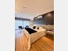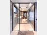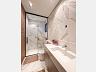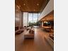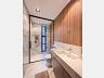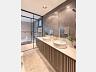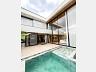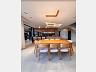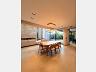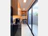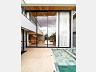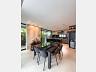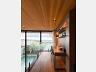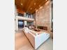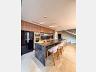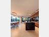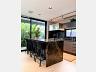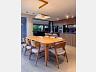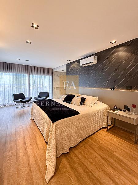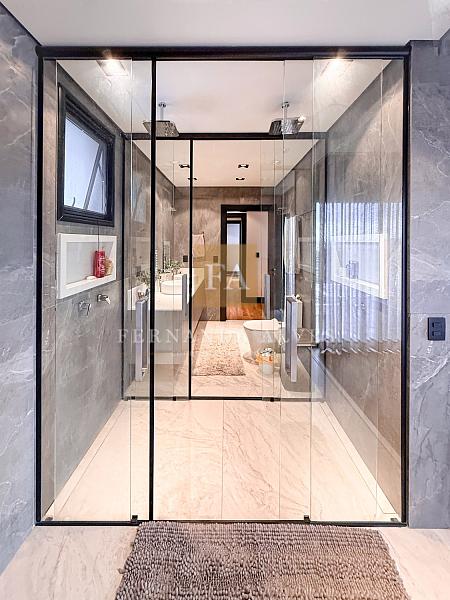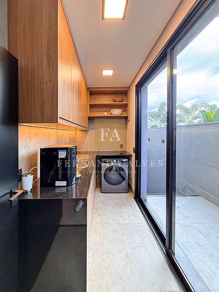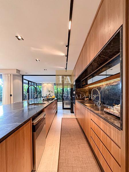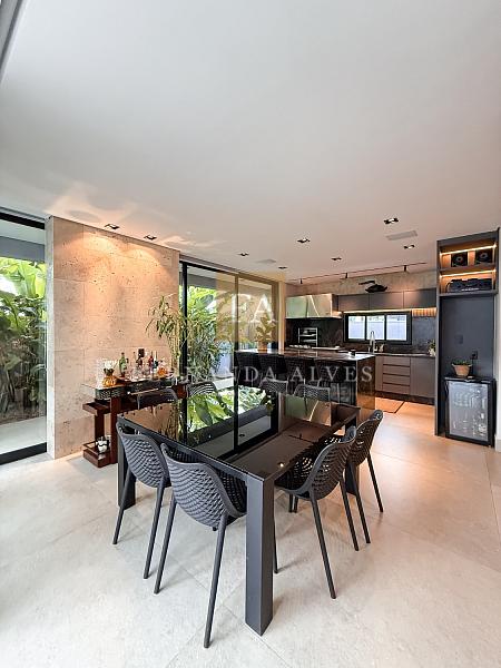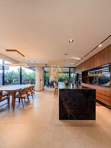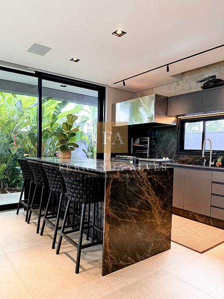 Cozinha interna com extensa bancada no jatobá browm Maximum, completa em eletrodomésticos e despensa. Área gourmet ao lado da cozinha, com fechamento em vidro para ser climatizada, seguindo mesmo padrão de acabamento da cozinha. Espaço gourmet também possui acabamento em travertino romano, banheiro completo e vista da piscina.