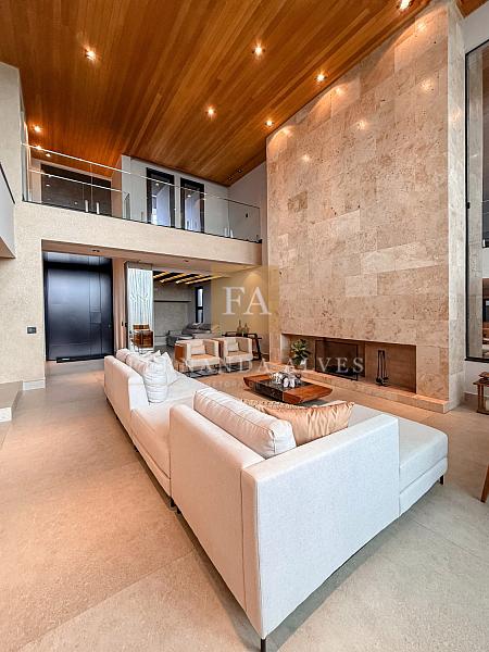 Ampla sala de visitas com lareira revestida no travertino romano, sala de TV um pouco mais isolada e espaço jantar conectado a cozinha interna.