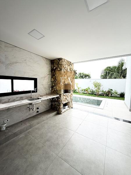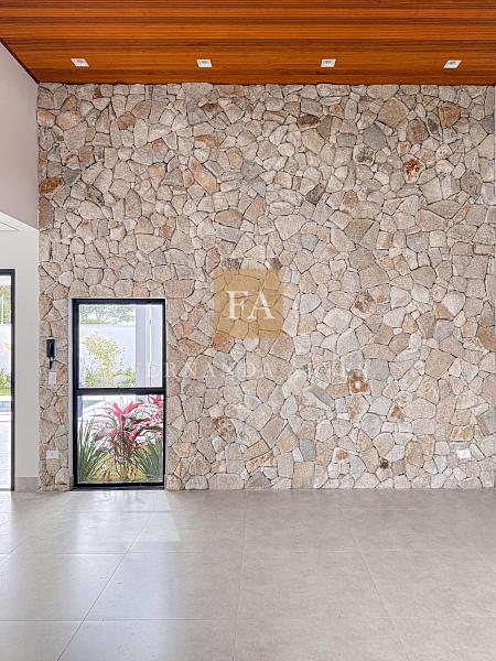 Fachada moderna, living para dois ambientes com sala de TV, jantar e lavabo integrados a cozinha interna. Living com teto em madeira e parede toda revestida em pedra moledo, o que trouxe mais sofisticação a este ambiente. Espaço gourmet com churrasqueira a carvão também revestida em pedra moledo, piscina em alvenaria e ótimo espaço externo com gramado e jardim.