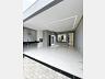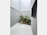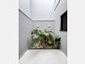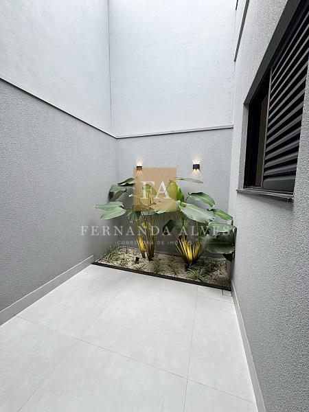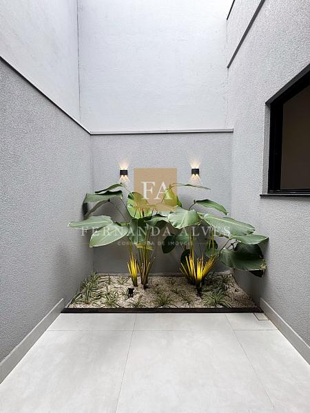 Garagem para dois carros coberta, áreas de luz com paisagismo e iluminação jardim.