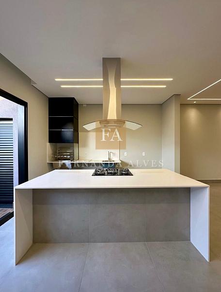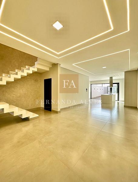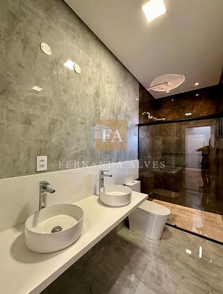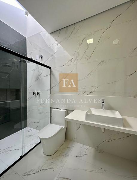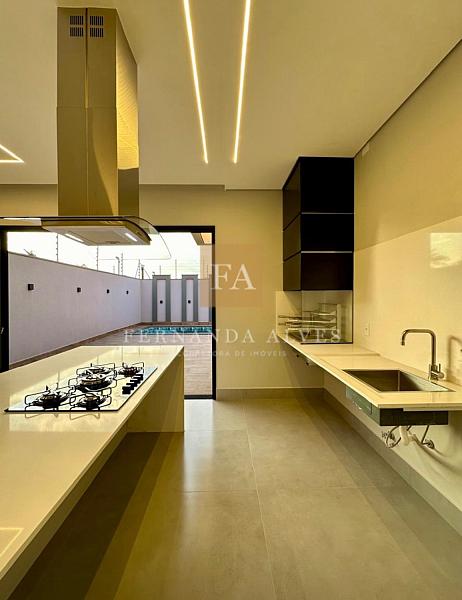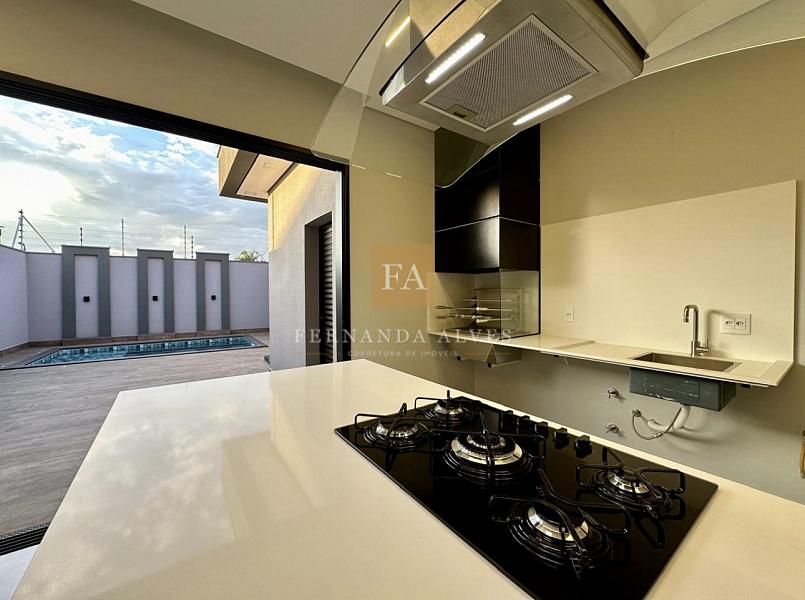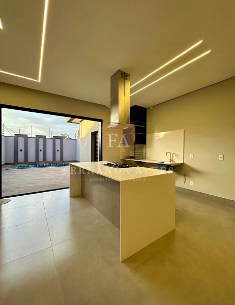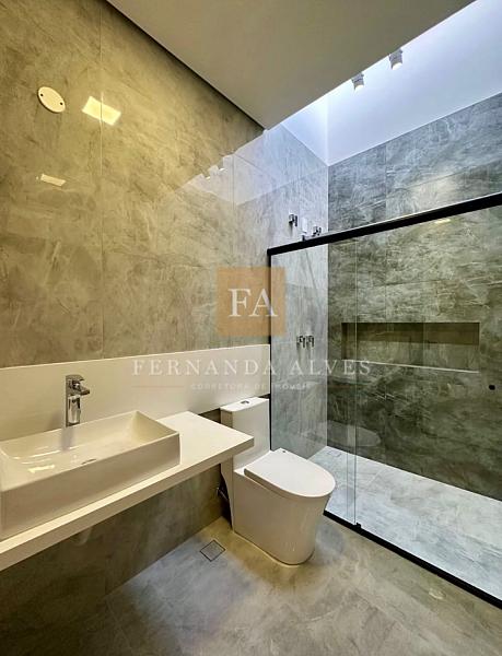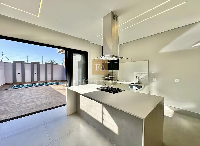 Casa recém-construída, acabamento alto padrão, cozinha gourmet integrada com sala de jantar, piscina, banheiro.