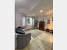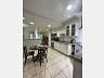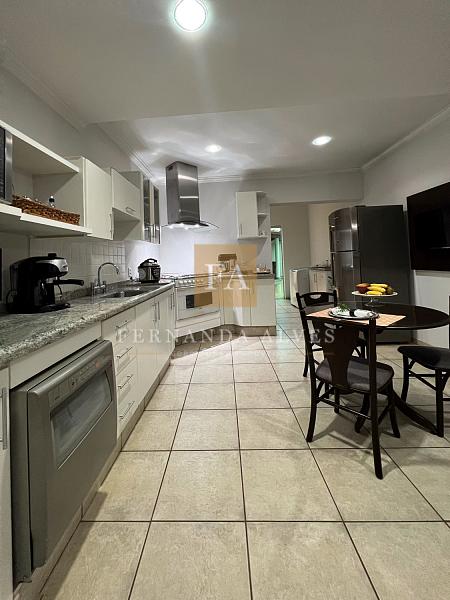 Piso térreo com sala de jantar, sala de estar com 3 ambientes, cozinha com coifa, fogão elétrico, despensa e lavanderia.