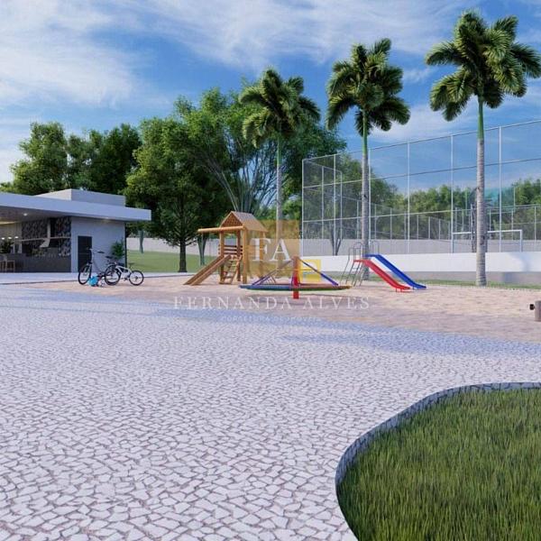 O condomínio será entregue com, quadra poliesportiva, salão de festas, quiosque externo, pista de caminhada em volta do lago e playground.