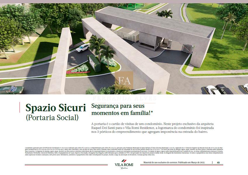 - Spazio Sicuri (Portaria Social) - A portaria é o cartão de visitas de um condomínio. Neste projeto exclusivo da arquiteta Raquel Dei Santi para o Vila Romi Residence, a logomarca do condomínio foi inspirada nos 3 pórticos do empreendimento que agregam imponência na entrada do bairro.